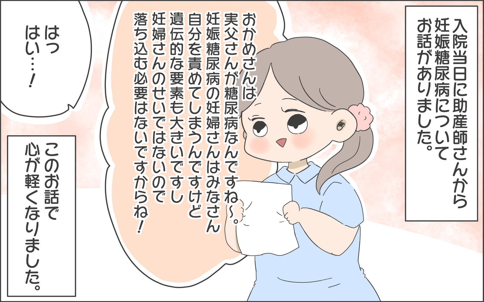 妊娠糖尿病による管理入院が決定し、家族への報告を済ませたおかめさん。