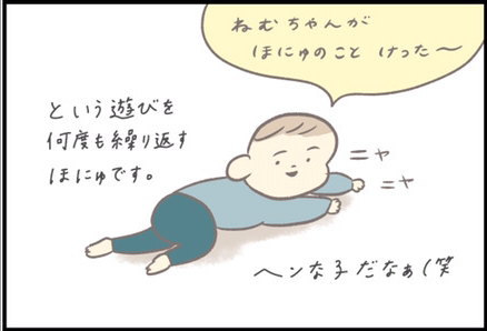 つぶみさんの長男・ほにゅくんは、妹・ねむちゃんと個性的な遊びをしているようです。ねむちゃんの足を自分のお腹にくっ付け、足を伸ばした反動で自分がひっくり返って楽しむ遊びにはビックリです。もしかしたら、赤ちゃんの足はふわふわしていて心地が良いのかもしれませんね。