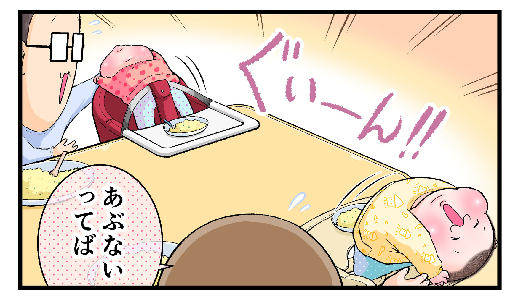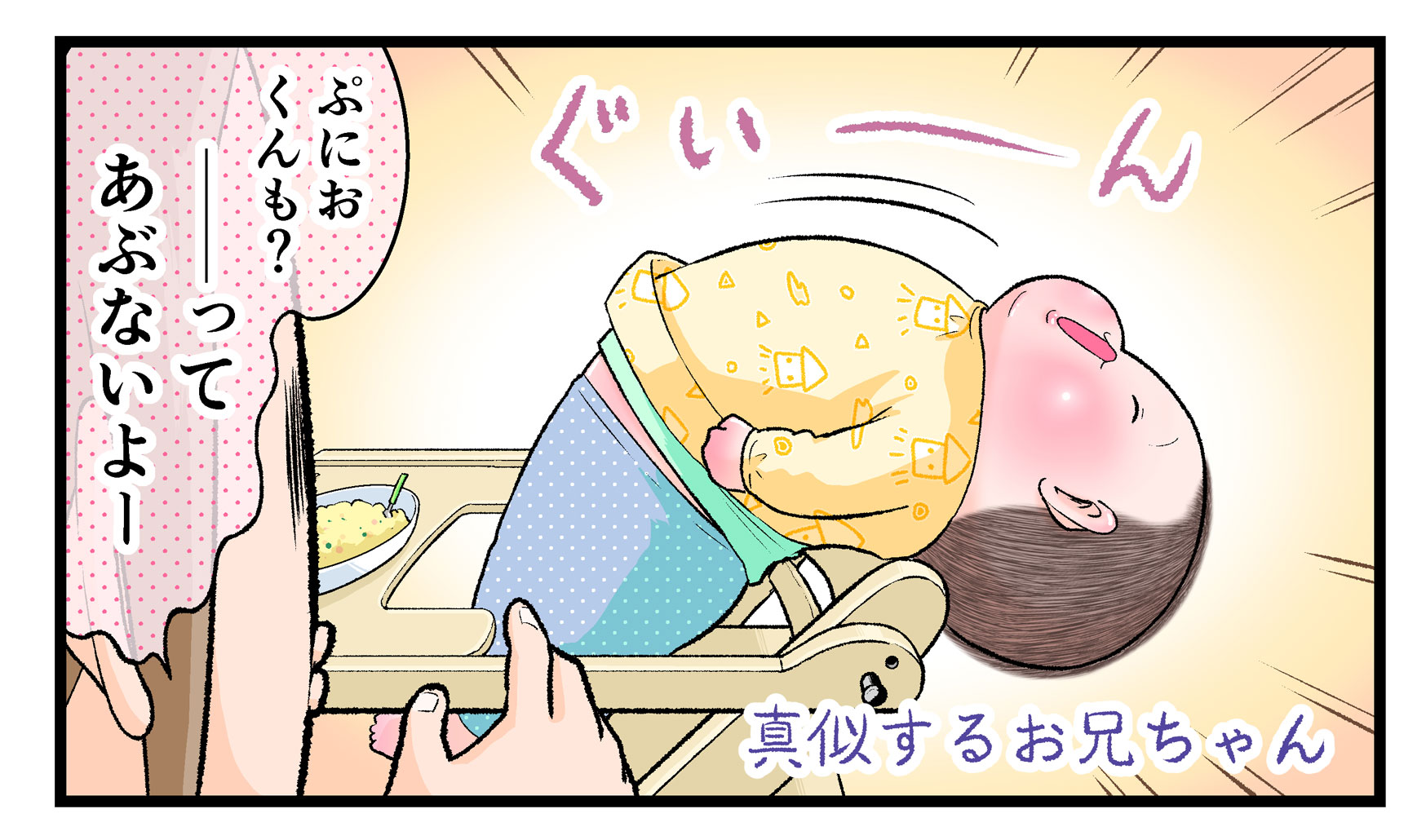 赤ちゃんはさまざまな気持ちを表情や身体を使って表現します。前回でにくきゅうぷにおさんの次男・ぷにすけくんが、食事中に椅子の上でグイーンと反り「おいしい」と表現していました。ヒヤッとするシーンではパパが頭を支えて危険を防いでいましたが、今度は長男・ぷにおくんがグイーンと反り返り…。