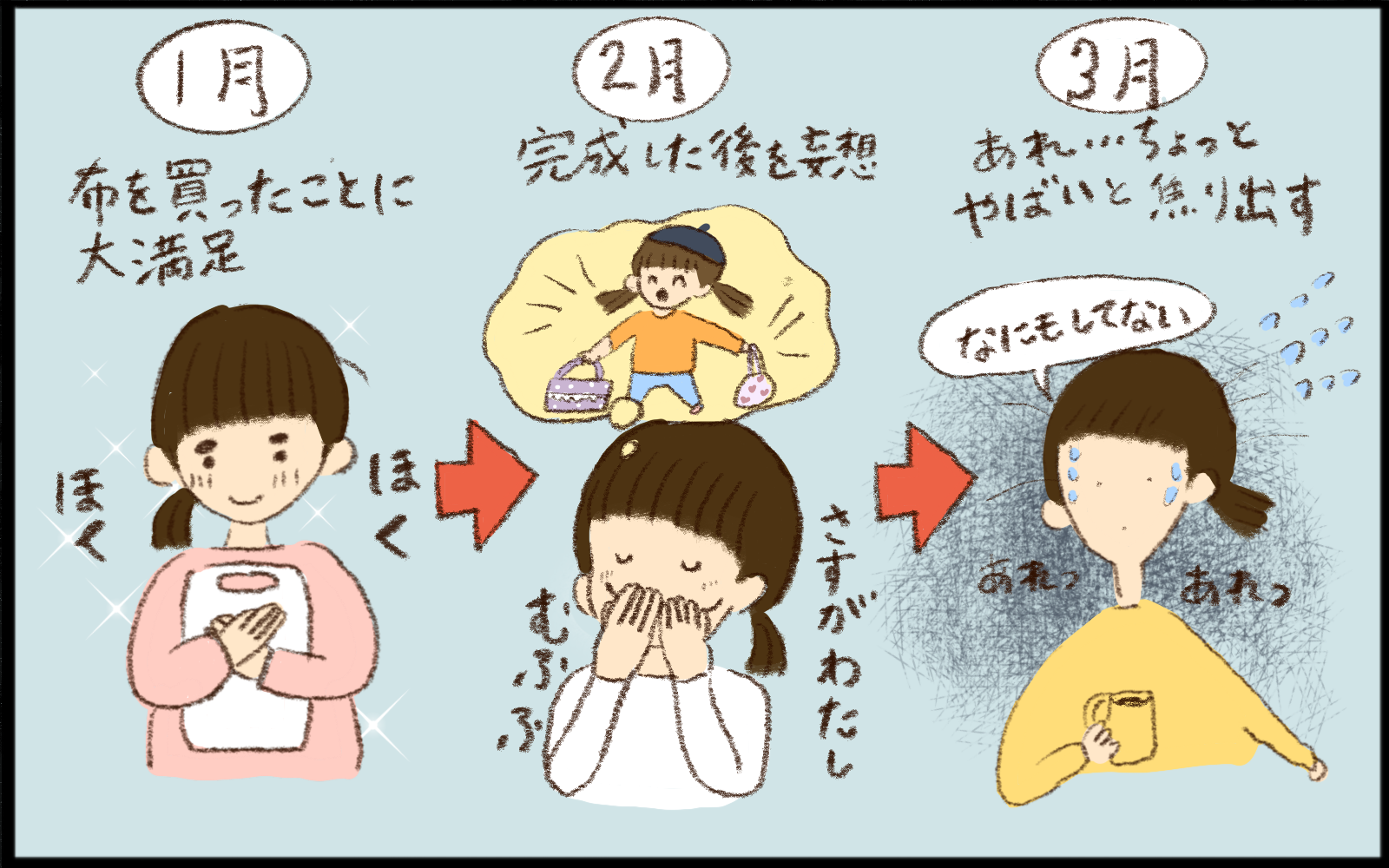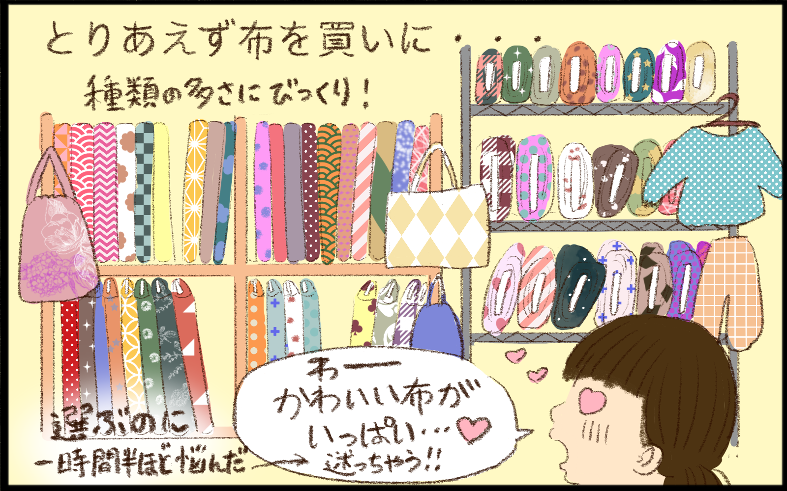 ところが、手芸屋さんに並んだ生地の多さにビックリ! 選びに選んでようやくかわいいい布を購入したのですが、それに満足して何もせず、1月、2月、3月と、あっという間に月日が流れ…。