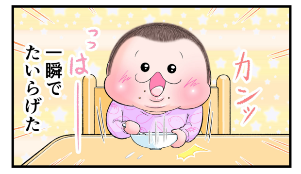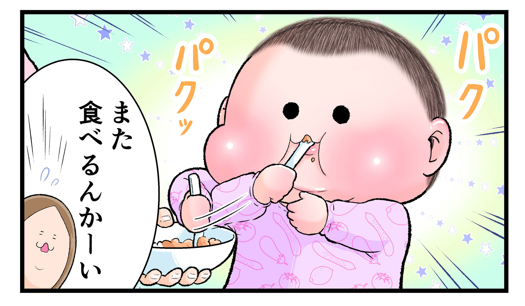 ところが、スプーンに残ったご飯をじっと見て…パクリと食べたぷにおくん。その一口がおいしかったのでしょう。