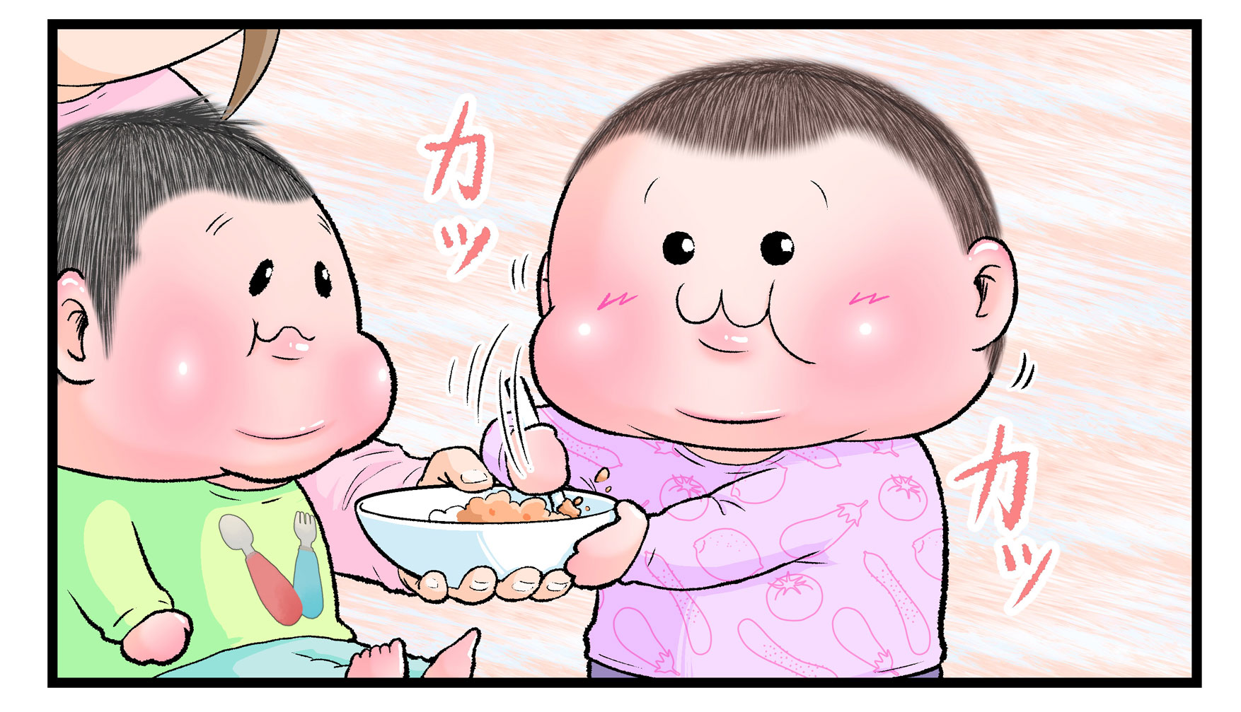 次男・ぷにすけくんの食事中。長男・ぷにおくんが「あい、あーむ」とスプーンを持つ手をプルプルさせながら弟の口にご飯を運び…ぷにすけくんがパクッと食べるととっても嬉しそう。さらにはお茶も与えて満足気。