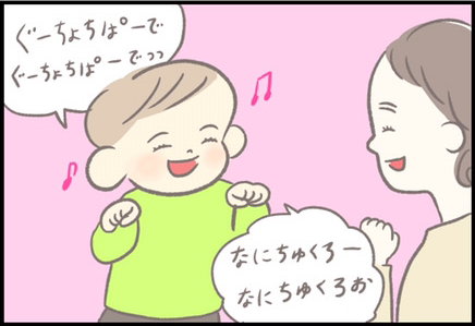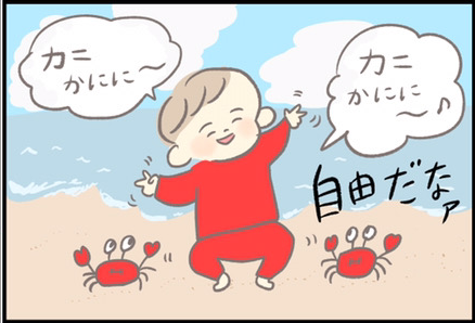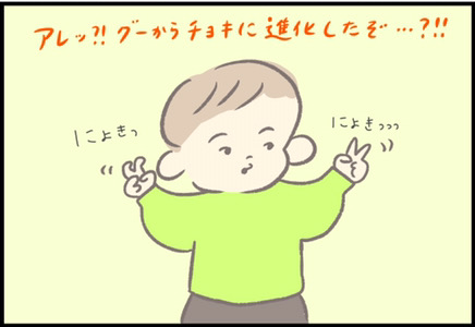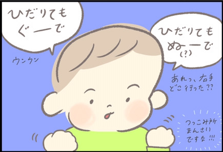 さて、今回はつぶみさんの息子・ほにゅくんの手遊びについてです。「グーチョキパー」の手遊びは、カタツムリになったりヘリコプターになったり…幅広い遊びができます。ほにゅくんは両手が「グー」(片方は「ぬー(?)」)と言っていたにも関わらず、いつのまにか「チョキ」になって、カニに変身してしまいました。