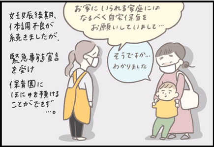 SNSで大人気・つぶみさん(@tbys141122)の「ままのて」妊娠・育児マンガです。2020年初頭から徐々に流行しだした新型コロナウイルス。妊娠中の方、育児中の方、各家庭によってさまざまな思いがあったことでしょう。ここでは、つぶみさんが経験したコロナ禍での二人目妊娠中の思い出をご紹介します。