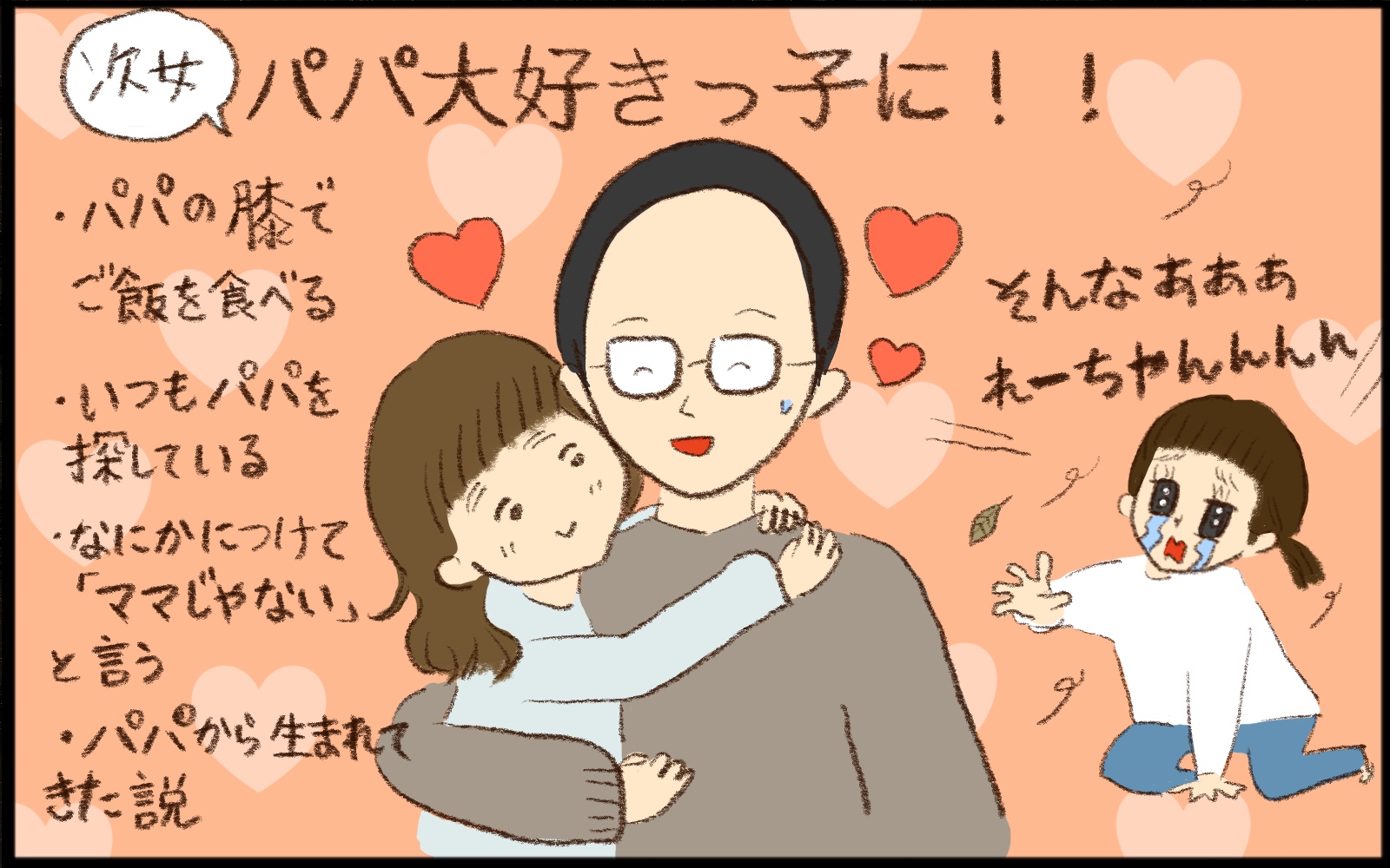 三女を妊娠中は、お腹が大きくなるにつれて育児にも寝かしつけにも余裕がなくなり、必然的にパパがれーちゃんの面倒を見るようになりました。もちろん、わたしもれーちゃんをフォローしてきたつもりですが、わたしが忙しくしていればれーちゃんはパパに寄り添い…このような経緯で見事にパパっ子になってしまったのです。