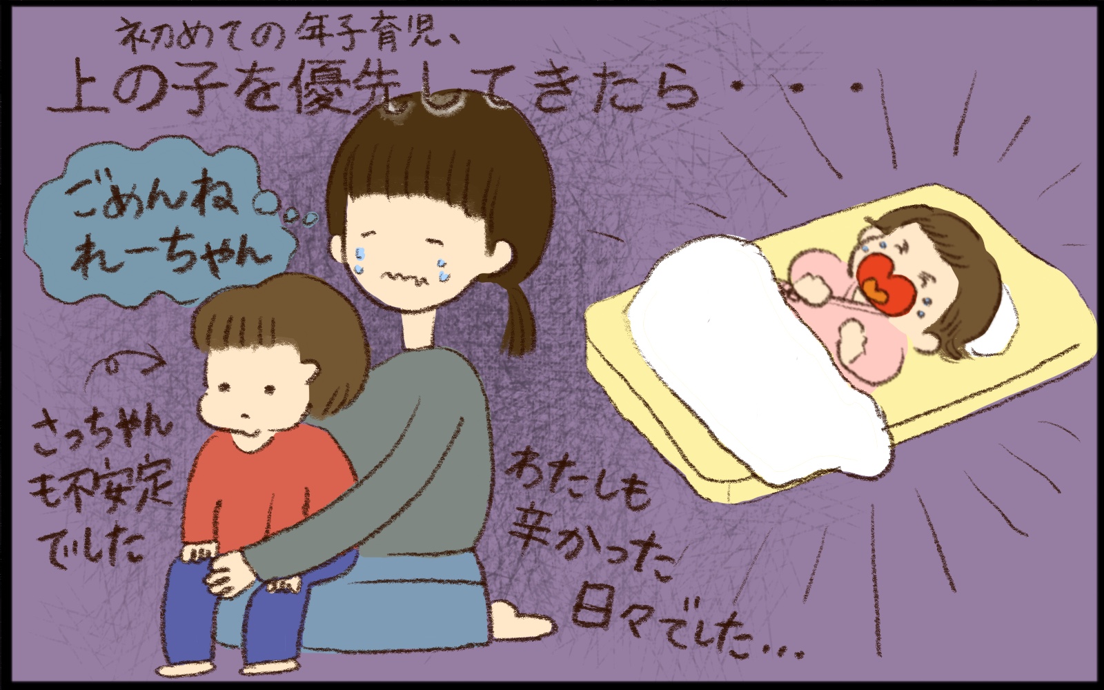 れーちゃんが泣いていても、さっちゃんが不安そうであればさっちゃんに付き添う…そんなことを続けているうちに、三女しーちゃんを妊娠しました。