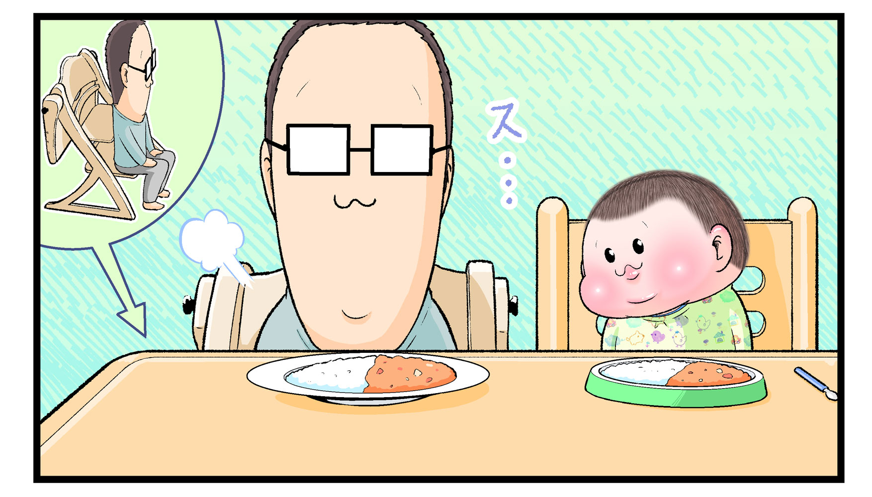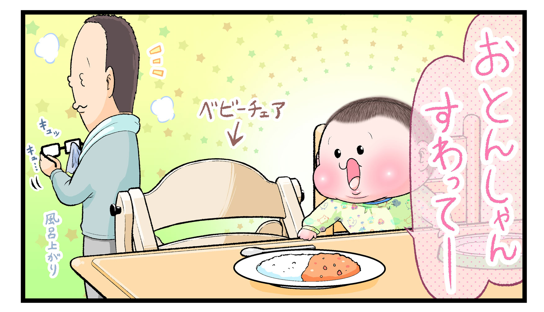 さて、にくきゅうぷにおさんの長男・ぷにおくんが2歳7ヶ月頃のエピソードをお届けしました。お風呂上がりのパパに「いただきますしよう」と食卓に呼んだのはいいものの、ぷにおくんが大人用の椅子に座っています。