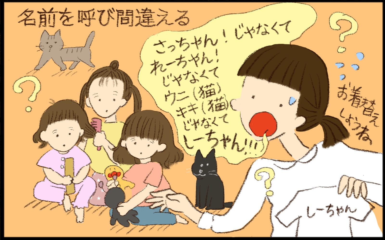 また、我が家では猫を2匹飼っています。我が子のように大切な家族のため、子どもの名前の代わりに猫の名前が出てくることもあります。ちなみに夫は、子どもたちをわたしの名前で呼んでしまうことが多々あります。