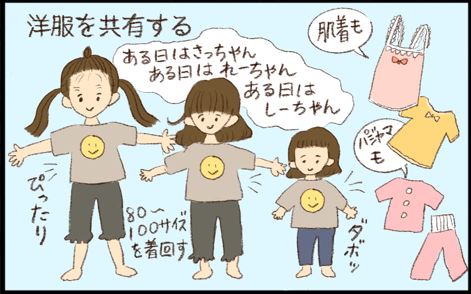 年子3姉妹育児の日常を描くエッセイマンガおおもりなつみさん(Instagram:omori_nigaoe)のコラムをお届けします。きょうだいがいると、おやつや洋服などをシェアするという方も多いでしょう。年子3姉妹の場合はどうなのでしょうか?ここでは、おおもりさんのお宅のきょうだいの関わりや生活の様子をお届けします。