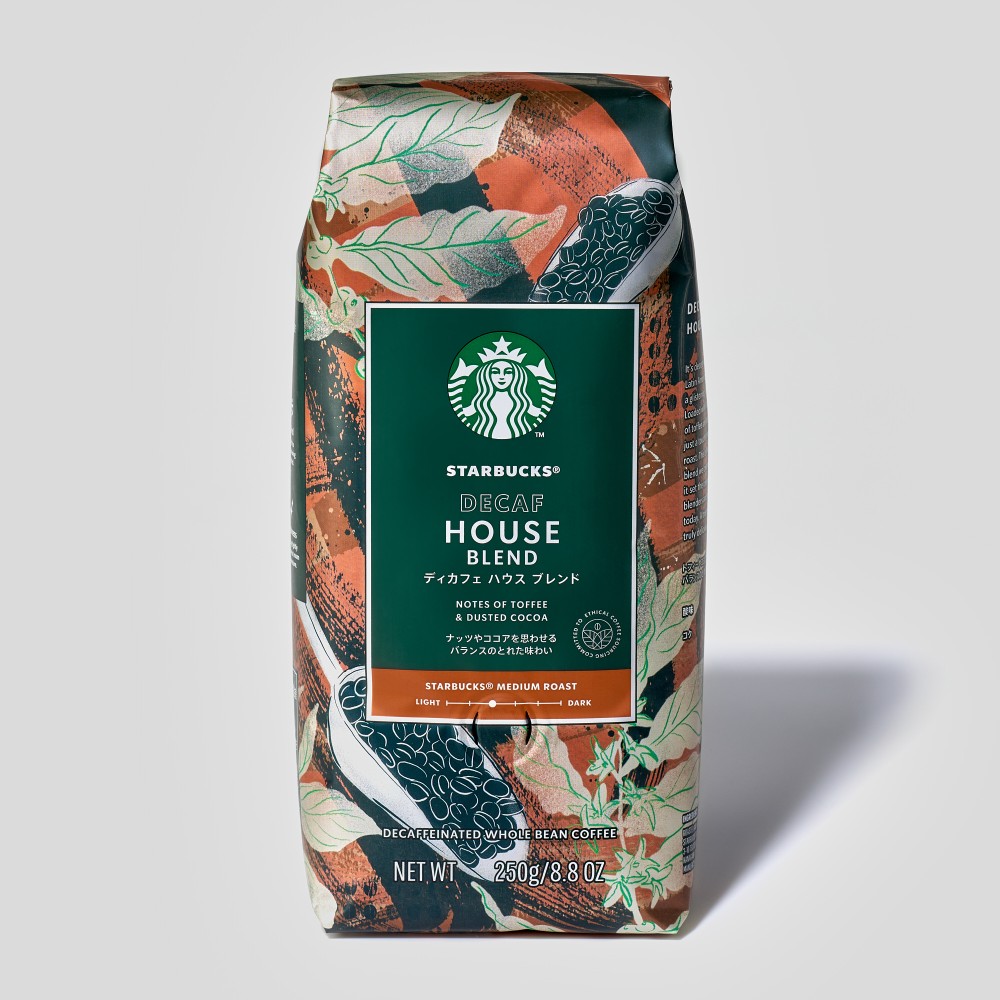 水洗式で加工したカフェインレスコーヒーです。スターバックスローストにより酸味とコクのバランスがとれたリッチな風味に仕上がっています。店舗とオンラインストアで扱っており、ギフトラッピングが可能です。