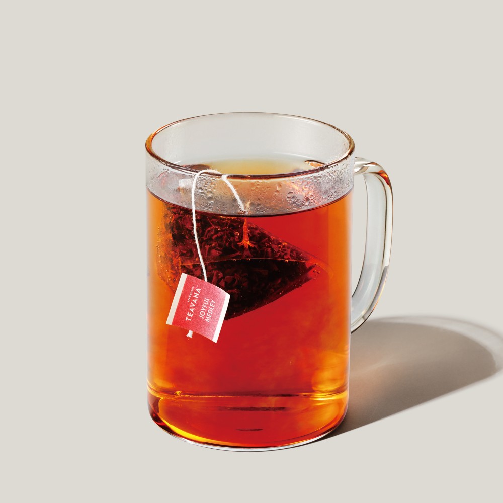 「ジョイフルメドレー」は、ブラックティー、ウーロン茶、そしてジャスミンティーの3種類の茶葉を使用した香り豊かなブレンドティーです。アプリコットがかすかに香り、華やかな風味が楽しめます。