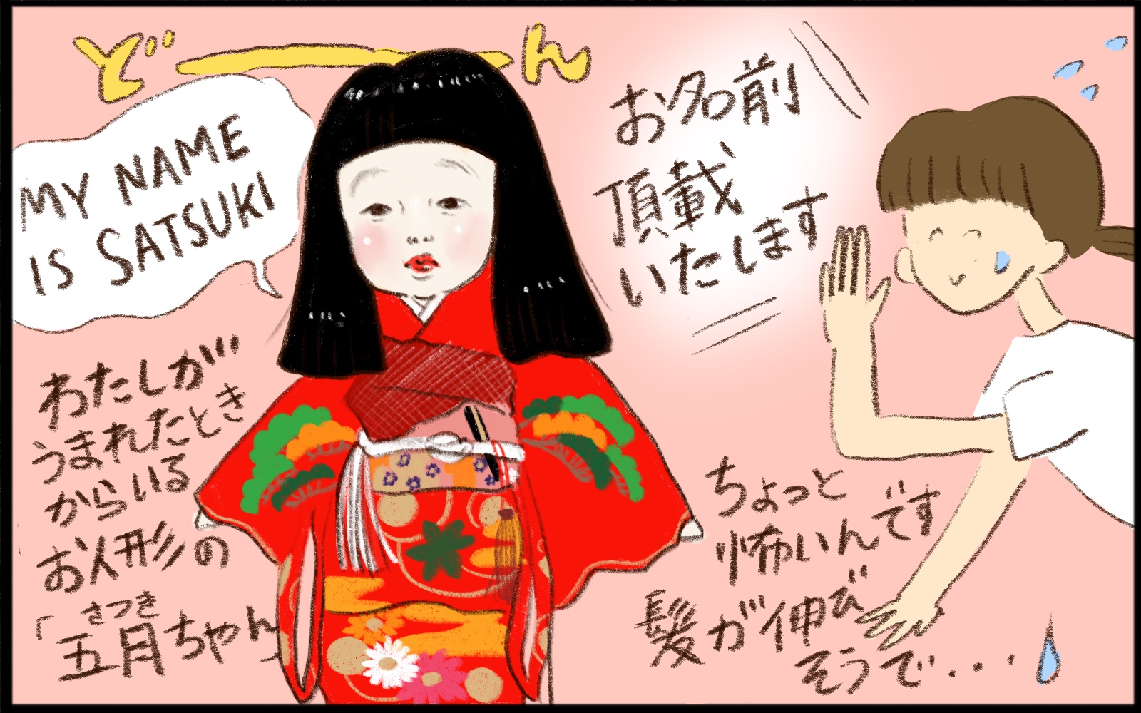 実は、実家に「さつきちゃん」と名付けた市松人形があり、この人形はわたしが生まれたときに祖母が贈ってくれたものでした。「皐」という漢字を見たときに、幼い頃から身近にあった市松人形のさつきちゃんが思い出され、「さつき」という名前をもらおうと考えました。