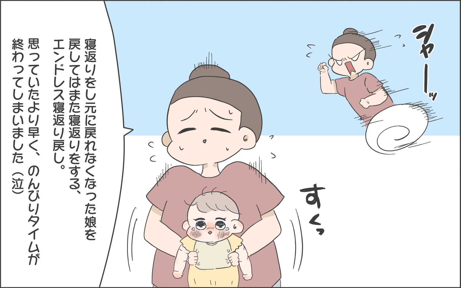 思ったよりも早くにはじまった寝返りを機に、おかめさんののんびり時間は早めに終わりました。こまめちゃんからますます目が離せなくなったものの、我が子の成長はとても嬉しいものです。