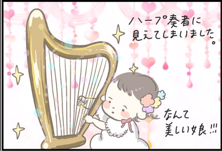 つぶみさんの長女、ねむちゃんは、入浴中に流れるシャワーのお湯を手でつかもうとしていたのだとか。つかめそうでつかめない…それだけでもかわいらしい仕草ですが、つぶみさんはそんなねむちゃんの姿が「まるでハープ奏者のよう」だったと言います。つぶみさんの発想で、ねむちゃんのかわいらしさに美しさが加わりましたね。ねむちゃんの将来は音楽家でしょうか。