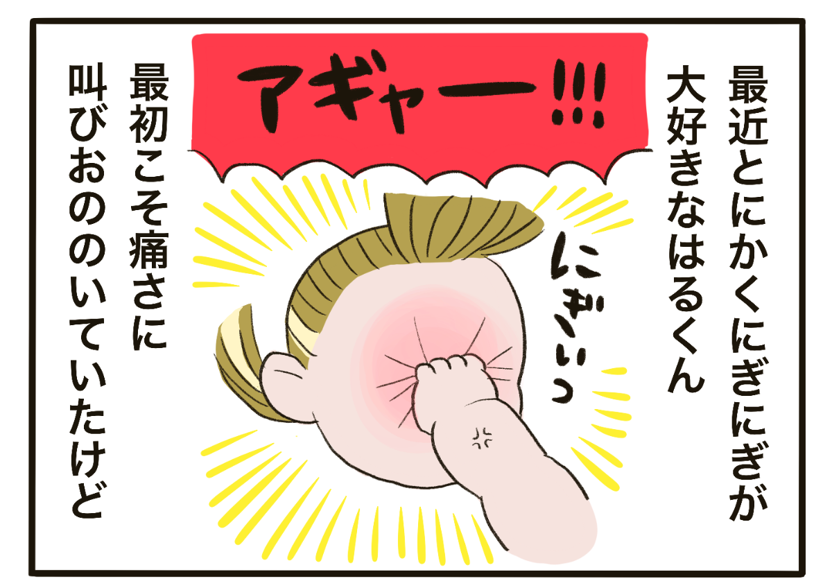 さて、ほかほか命さんの息子はるくんは生後8ヶ月。にぎにぎが大好きで、ママのこともたくさん触って握ってくるのだとか。ときには弱点とも取れる顔の弱い部分など握られ、その痛さにおののくシーンに共感する方も多いのではないでしょうか。