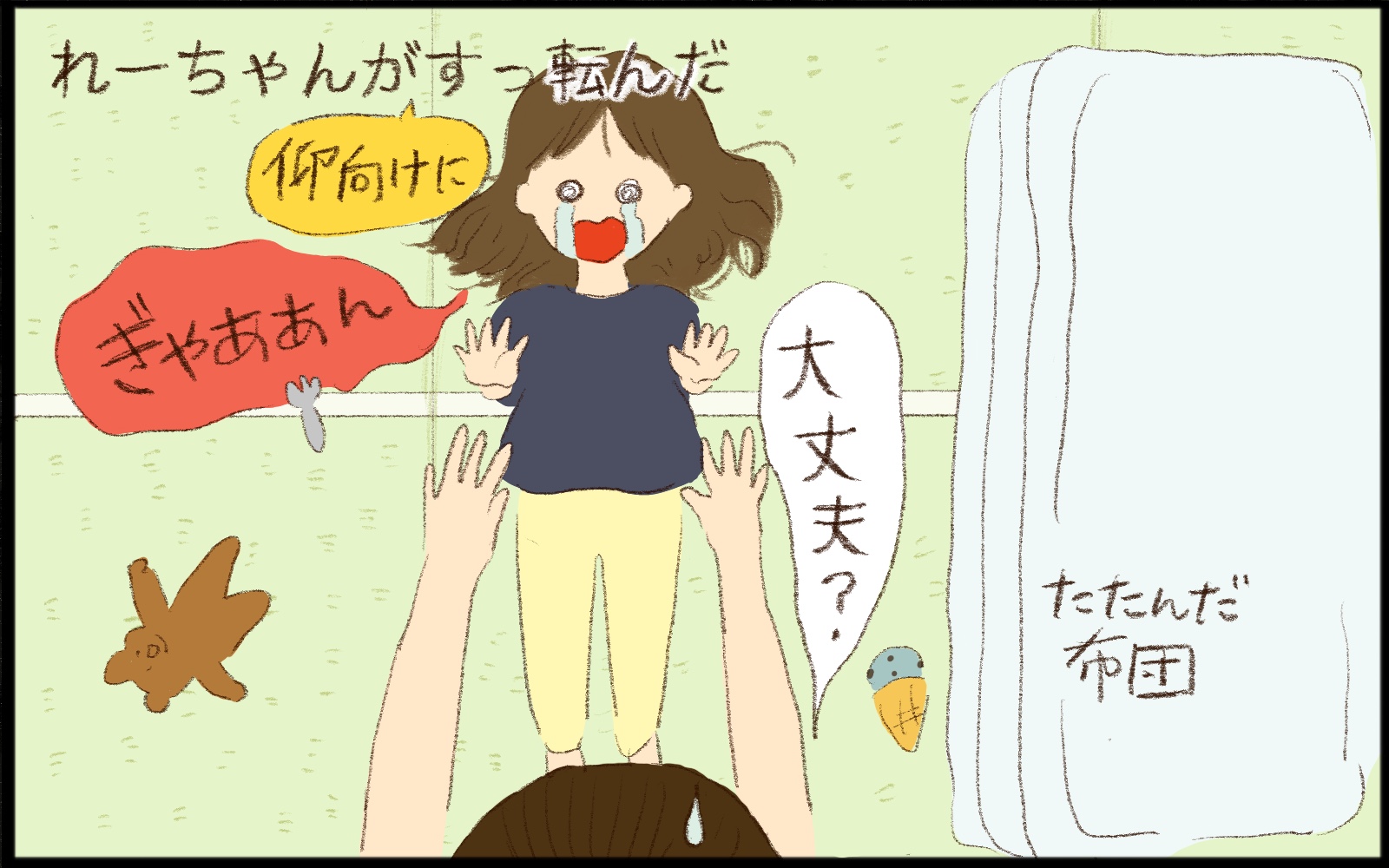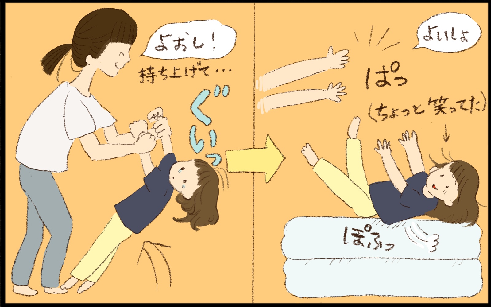 以前、れーちゃんが家の中で走って転んだときのことです。倒れていたれーちゃんの両手首をつかんで持ち上げ、布団の上に乗せたことがありました。