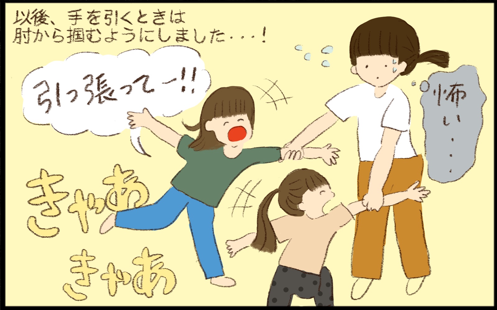年子3姉妹育児の日常を描くエッセイマンガ、おおもりなつみさん(Instagram:omori_nigaoe)のコラムをお届けします。子どもが転び、腕を引っぱって起こすのは日常でよくある光景ですよね。しかしこれが原因で腕を動かせなくなってしまうことがあるそうです。今回はおおもりさんがヒヤッとしたエピソードをご紹介します。