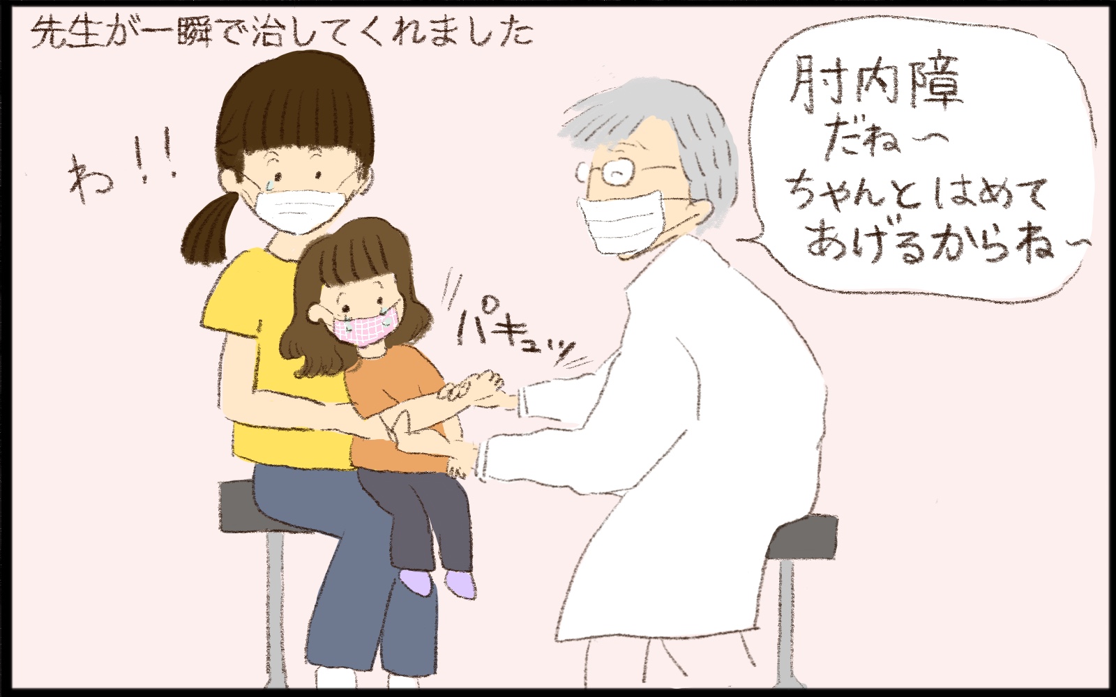 翌日、再度病院へ行くと、昨日とは違う先生が診てくれました。れーちゃんの肘を触診し「まだ外れちゃってるね」と言うと、肘と手首あたりを持ち内側にひねるように回しました。同時に「パキュッ」という音が。すると、れーちゃんは嘘のように泣き止みました。