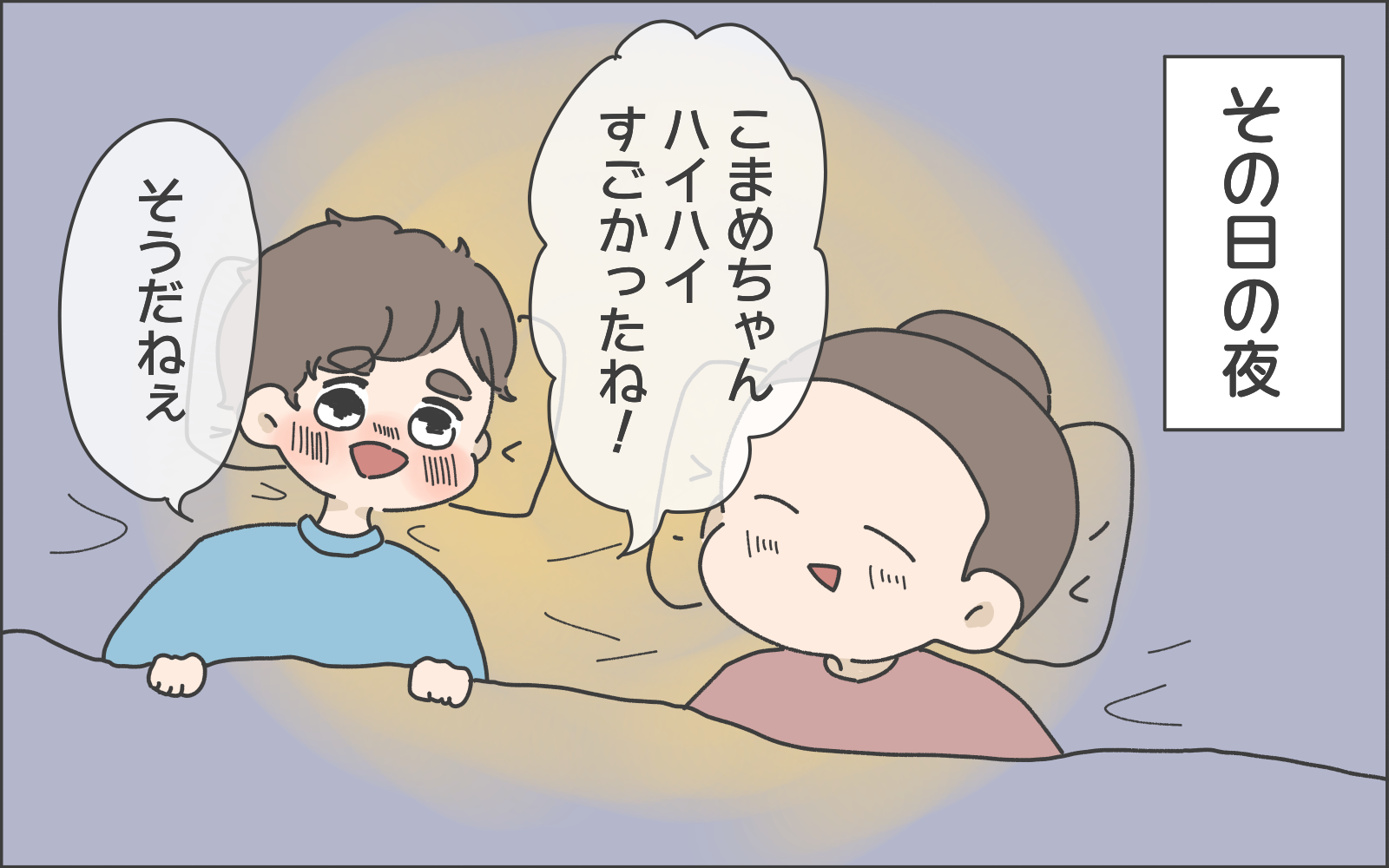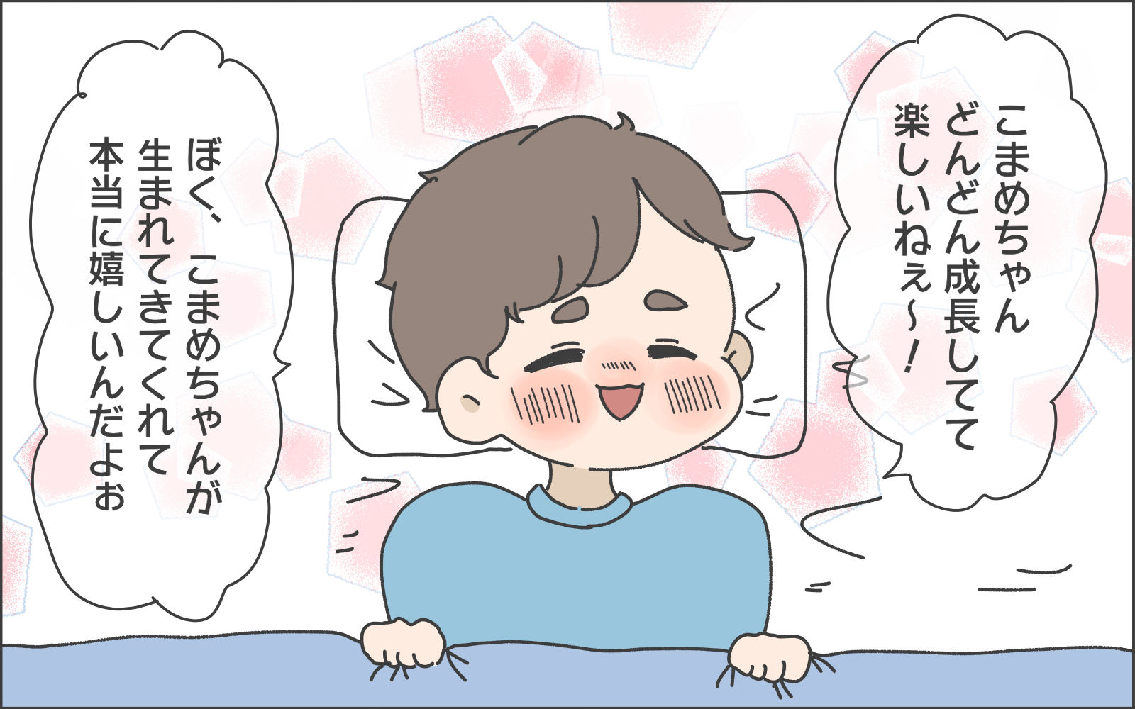 そんなある日、こまめちゃんのふとした成長をおまめくんが発見し、おかめさんに教えてくれました。そしてその晩、「こまめちゃんの成長が楽しい」「生まれてきてくれて嬉しい」とおかめさんにお話ししました。