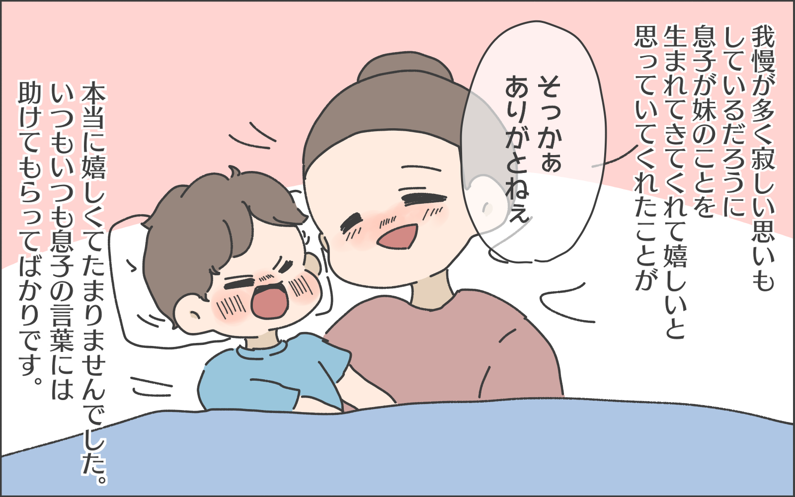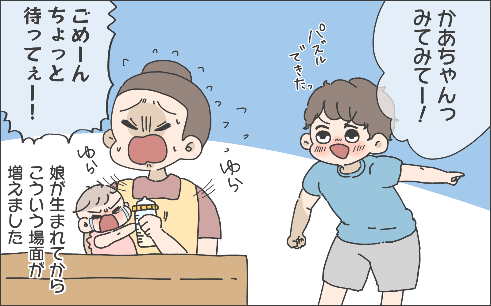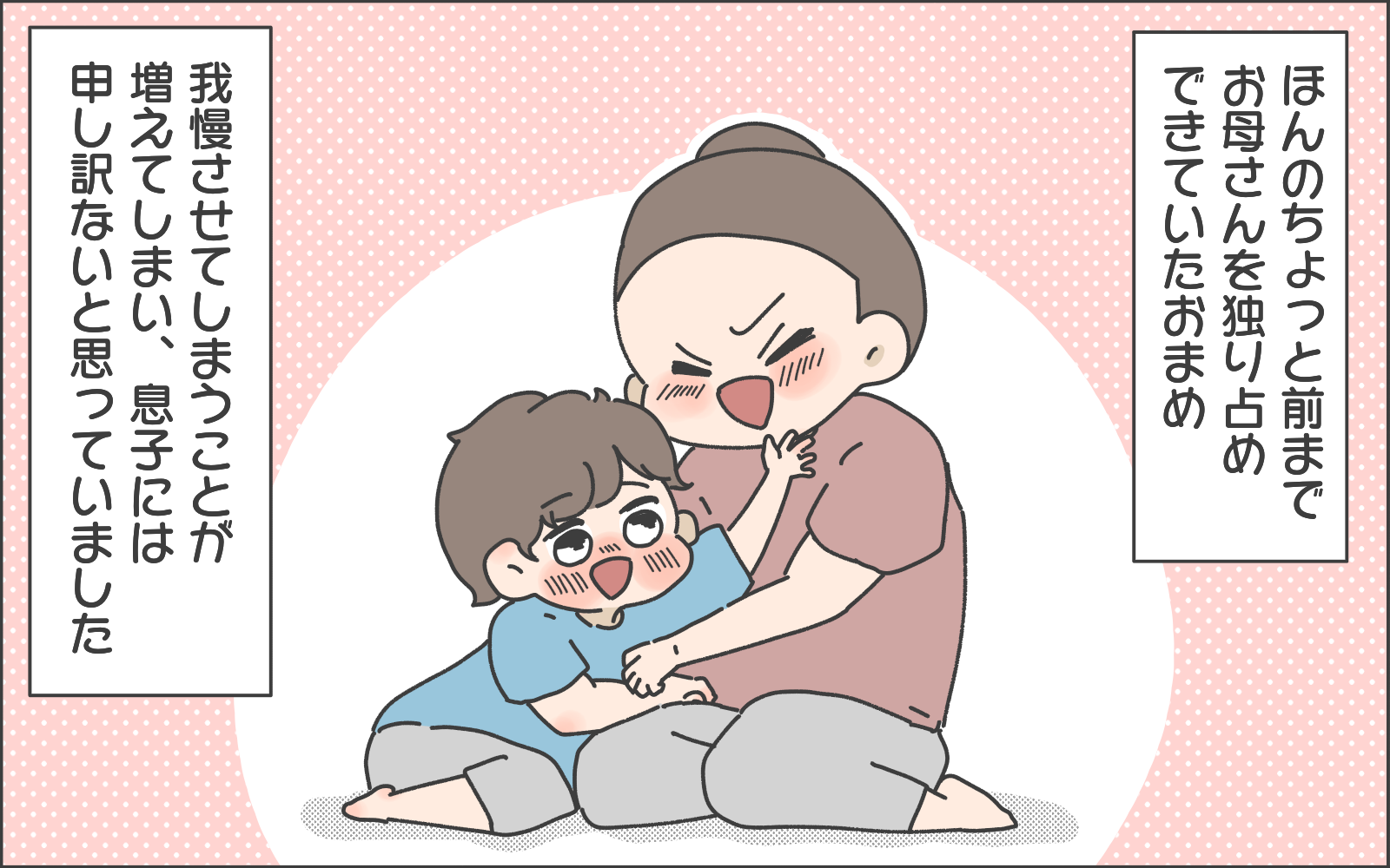 育児マンガ家おかめ(@omame_okame)さんの日常の出来事や奮闘をマンガでお届けします。二人目のこまめちゃんが生まれ日常生活が変化したおかめさん。まだ小さなこまめちゃんのお世話で慌ただしく、息子であるおまめくんは我慢することが多くなったそうです。おかめさんはそのことで悩んでいたようですが、ある日おまめくんから…。