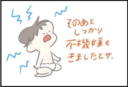 不思議なタイミングですが、ご機嫌がよく無敵モードのねむちゃんがグングン成長していく姿はとても微笑ましいですね。しかし天使の笑顔にいやされたのも束の間、熱が下がり発疹がでてくると一気に不機嫌になってしまったとのこと…。