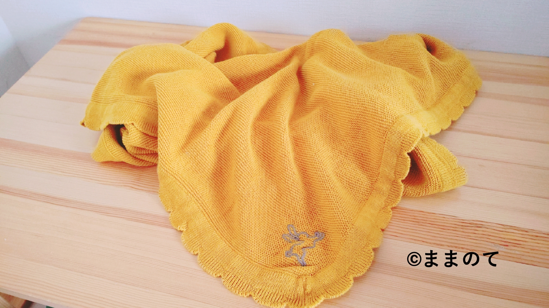 ダークイエローで暖かみがあり、うさぎの刺繍や縁取りがとてもかわいらしいデザインです。耐久性が良く洗うたびにやわらかくなるので、赤ちゃんにとってもお気に入りのアイテムになるかもしれませんね。