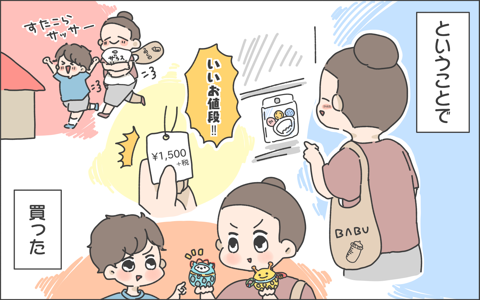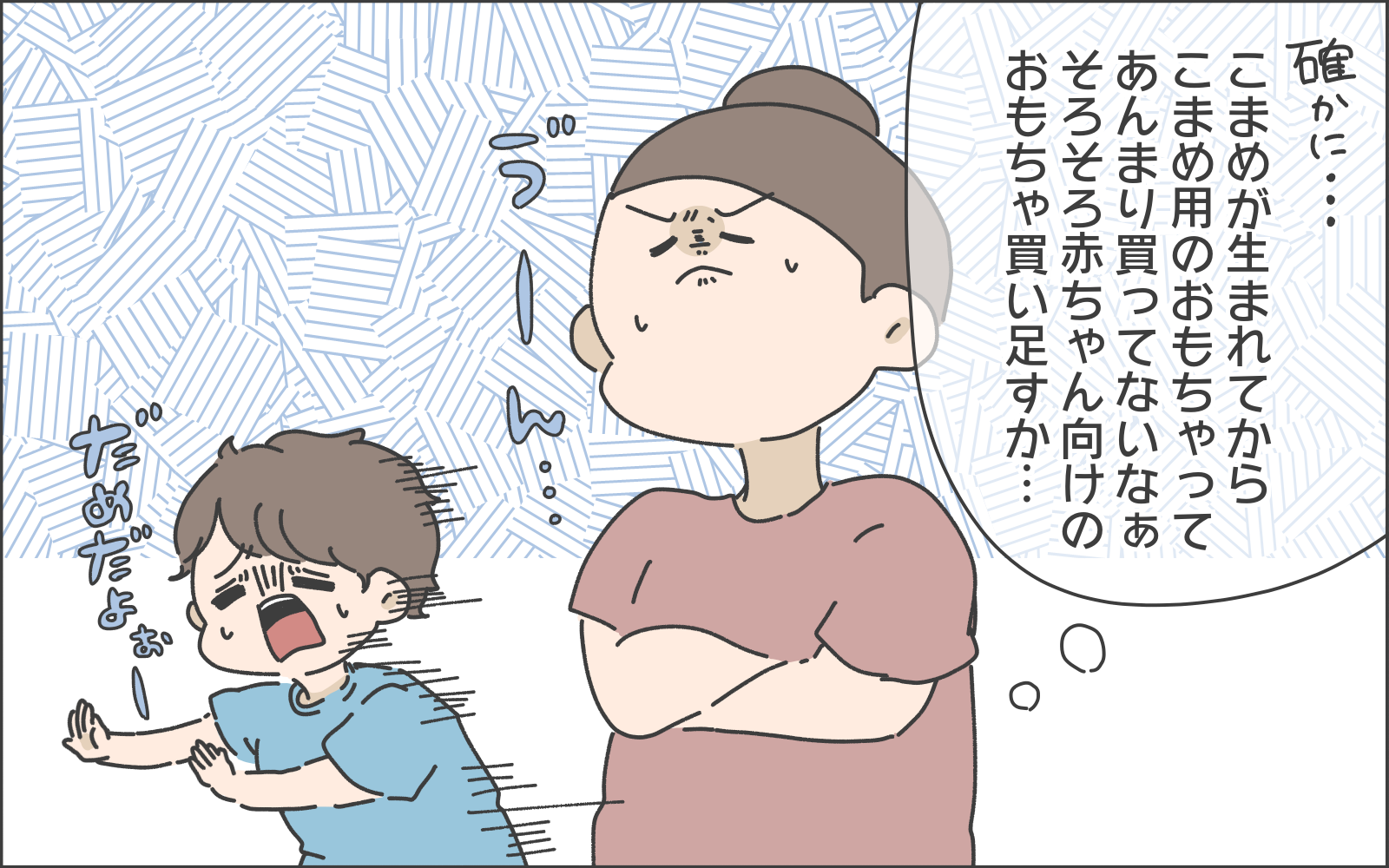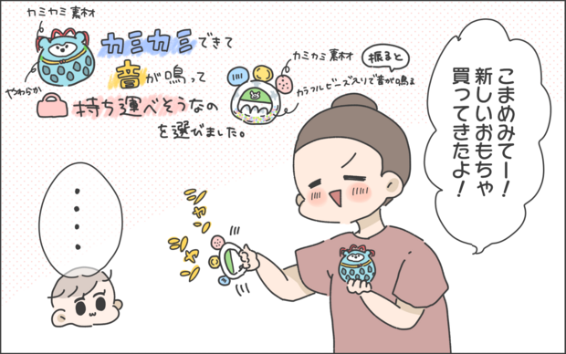 育児マンガ家おかめ(@omame_okame)さんの日常の出来事や奮闘をマンガでお届けします。二人目を出産後、生まれた娘のこまめちゃんへおもちゃをあまり購入していなかったおかめさん。そこである日、ようやく新しいおもちゃを購入することにしました。そして家に帰り、早速買ったおもちゃを与えるも…。
