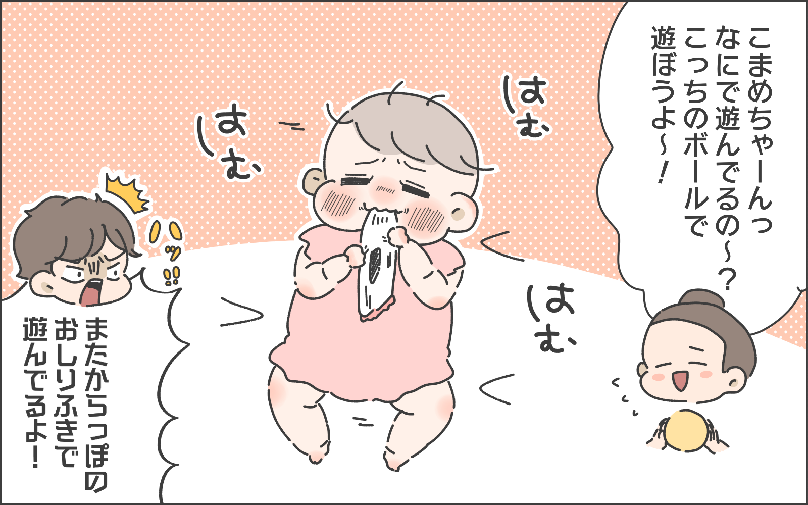 赤ちゃんが好みそうな、音の出るおもちゃやカミカミができるものを買い、遊んでもらおうといざおもちゃを与えましたが、こまめちゃんの反応は薄いもよう…。結局、新しいおもちゃには振り向かず、おしりふきの空袋がやっぱり好きなこまめちゃん。