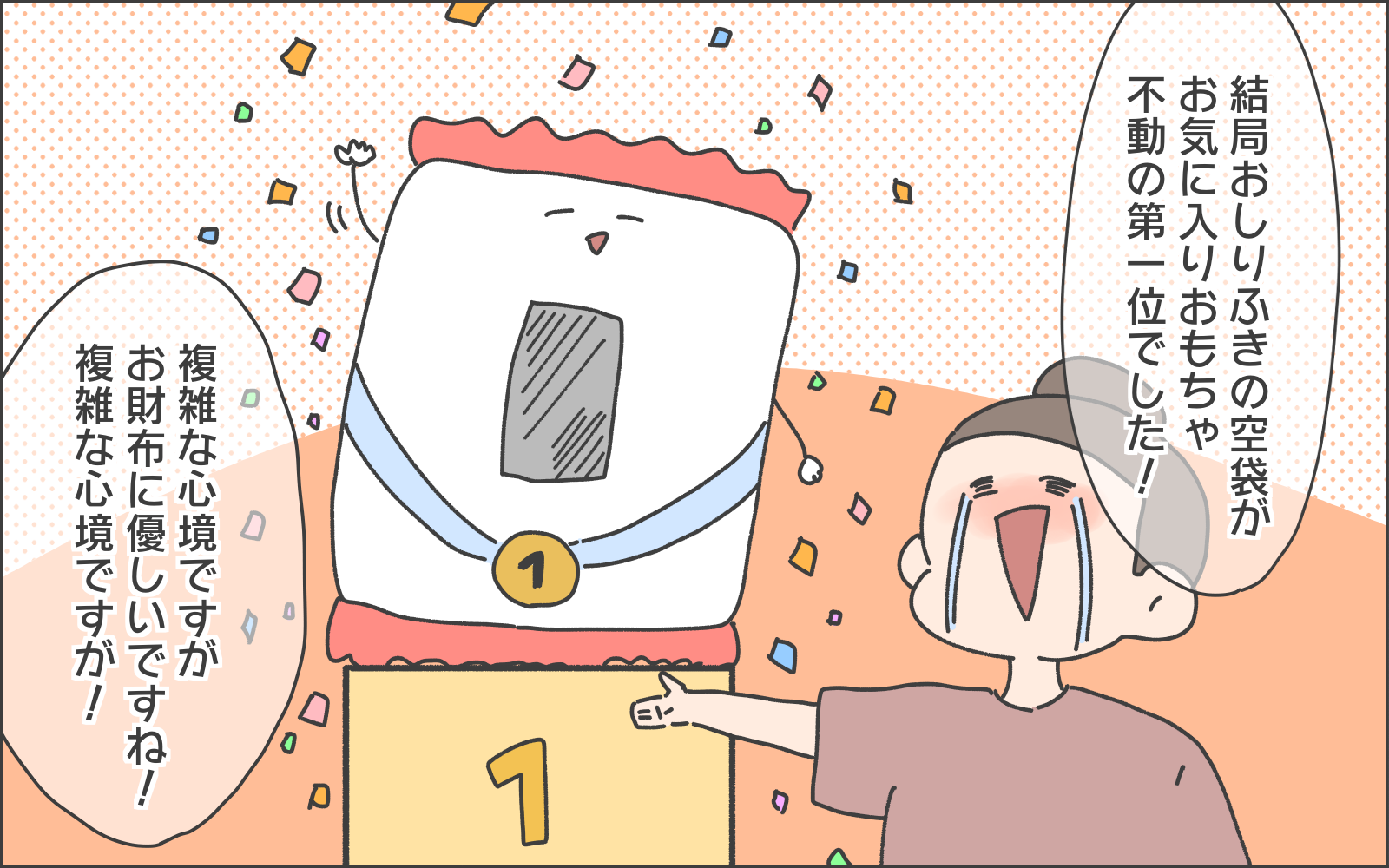 買い与えたおもちゃよりも、おしりふきの空袋を気にいるとは、親としては何とも言えない複雑な気持ちになったことでしょう。赤ちゃんらしい、親の心子知らずのほっこりな出来事に心が和みます。そして、おかめさんの言うように、お財布にはとっても優しいですね…!