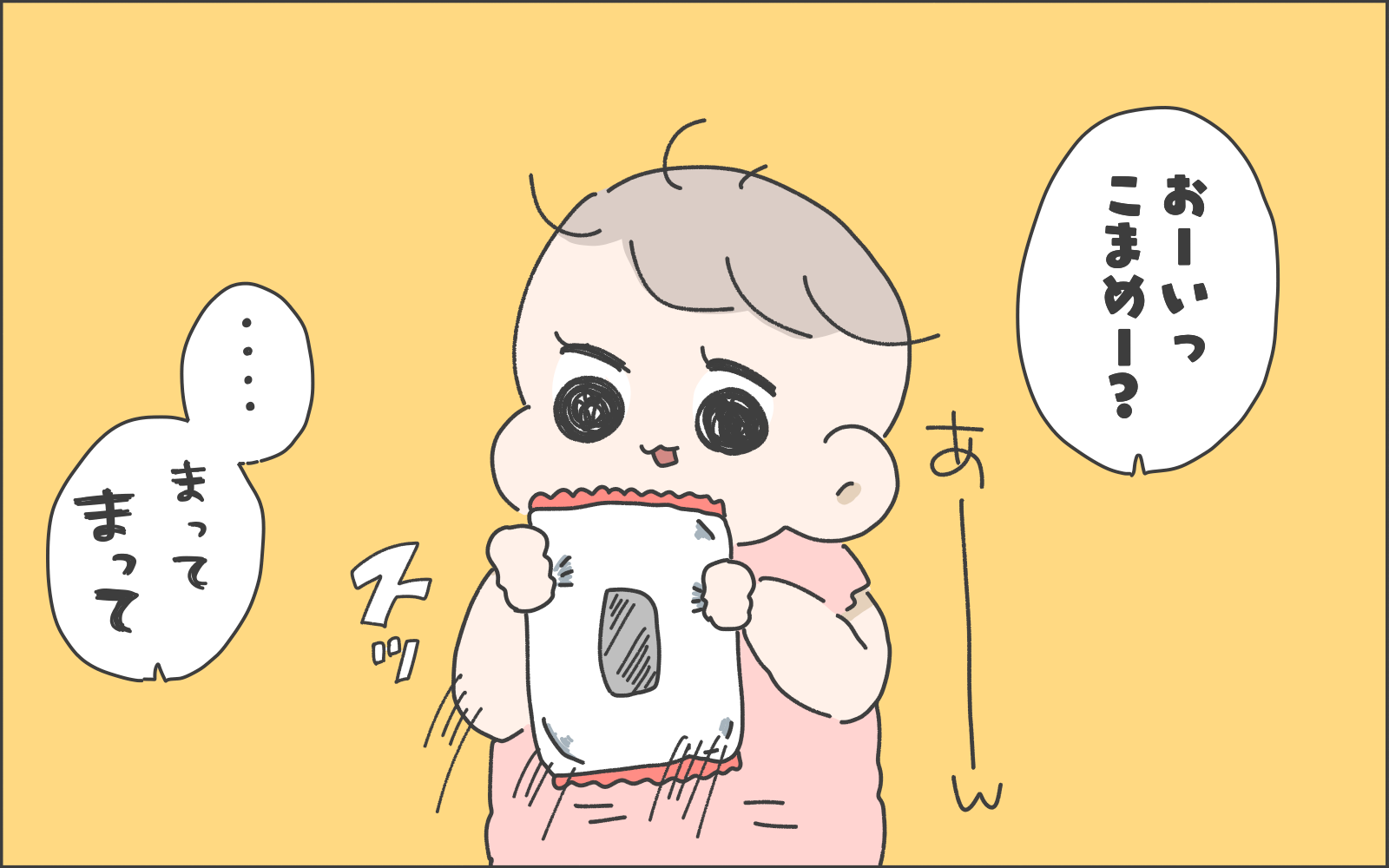 二人目育児に奮闘中のおかめさんは、娘のこまめちゃんにおもちゃをあまり買い与えていなかったようです。そのためか、こまめちゃんはいつも、おしりふきの空袋で遊んでいました。しかし、それは良くないかなと思ったおかめさんは、新しいおもちゃを購入することに。