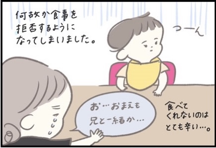 つぶみさんの第二子・ねむちゃんも生後11ヶ月頃に食事をイヤイヤするようになってしまいました。ねむちゃんの食事を拒否する姿に、長男・ほにゅくんも同じように食事を拒否していた時期があったことを思い出したそうです。