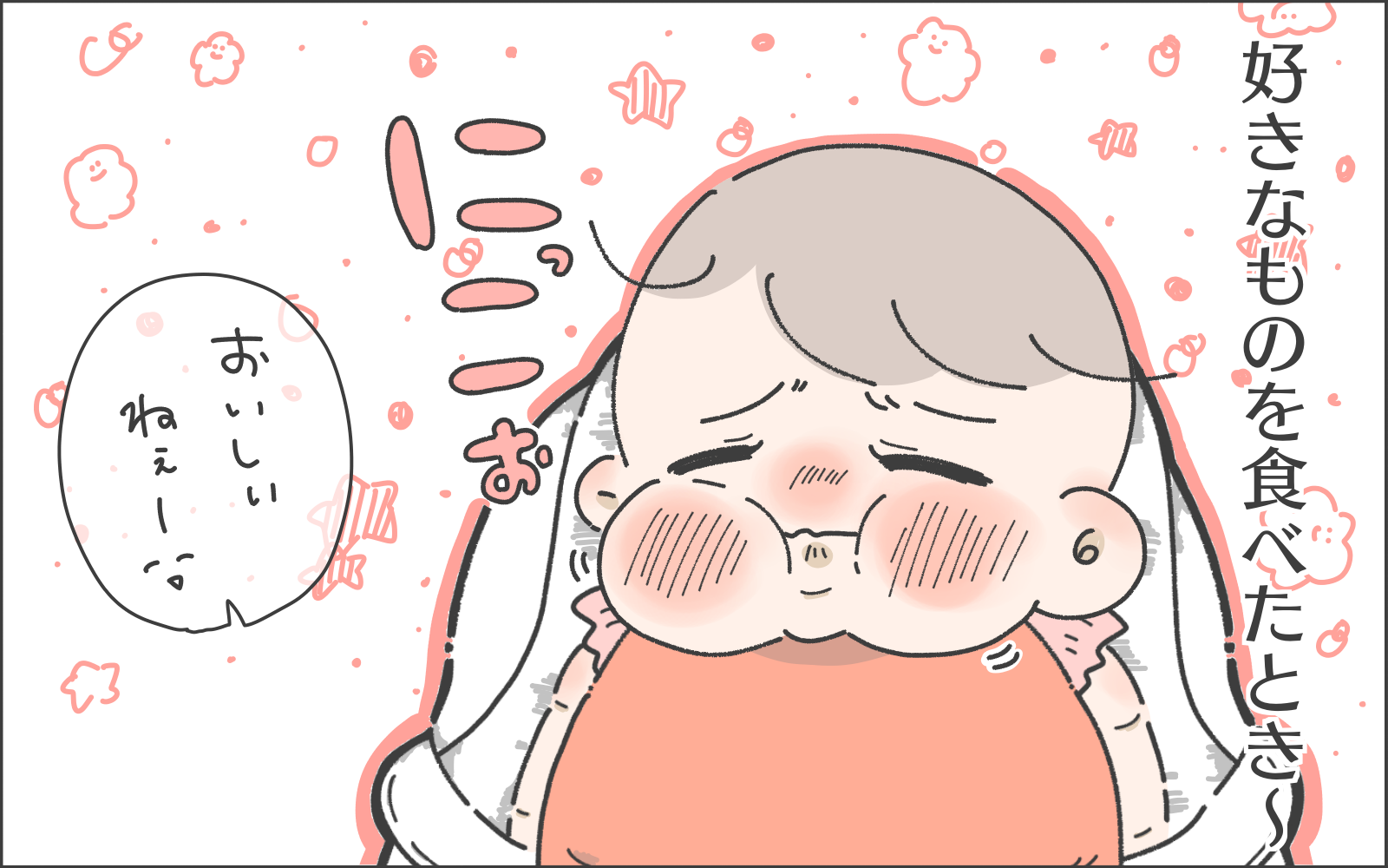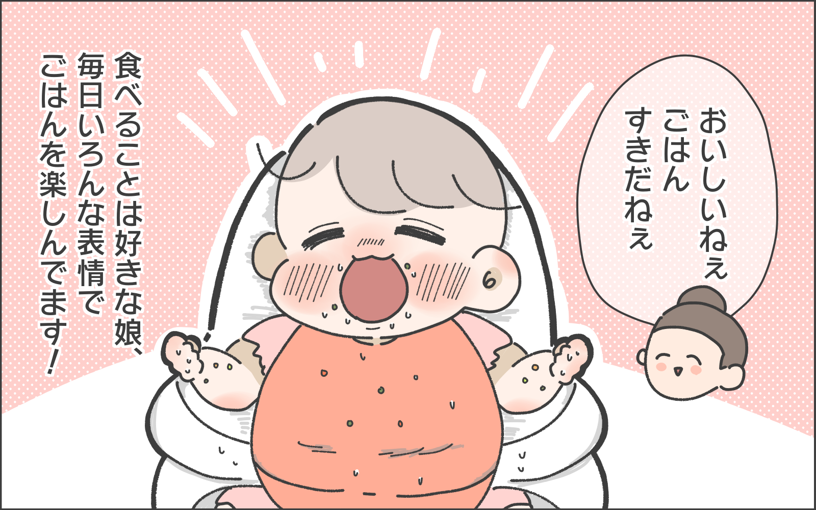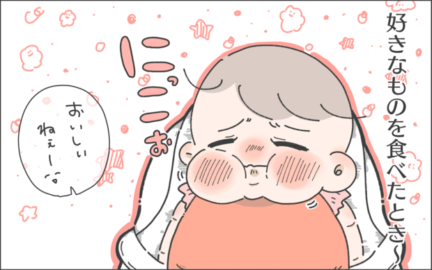 甘かったり苦かったり、味がしなかったり…、口にしてもぐもぐと食べたときのこまめちゃんの表情が、何とも可愛らしいですね。美味しいとき、そうでもないときなど、めいいっぱいの表情で教えてくれるその赤ちゃんらしい表現に、とても癒やされます。