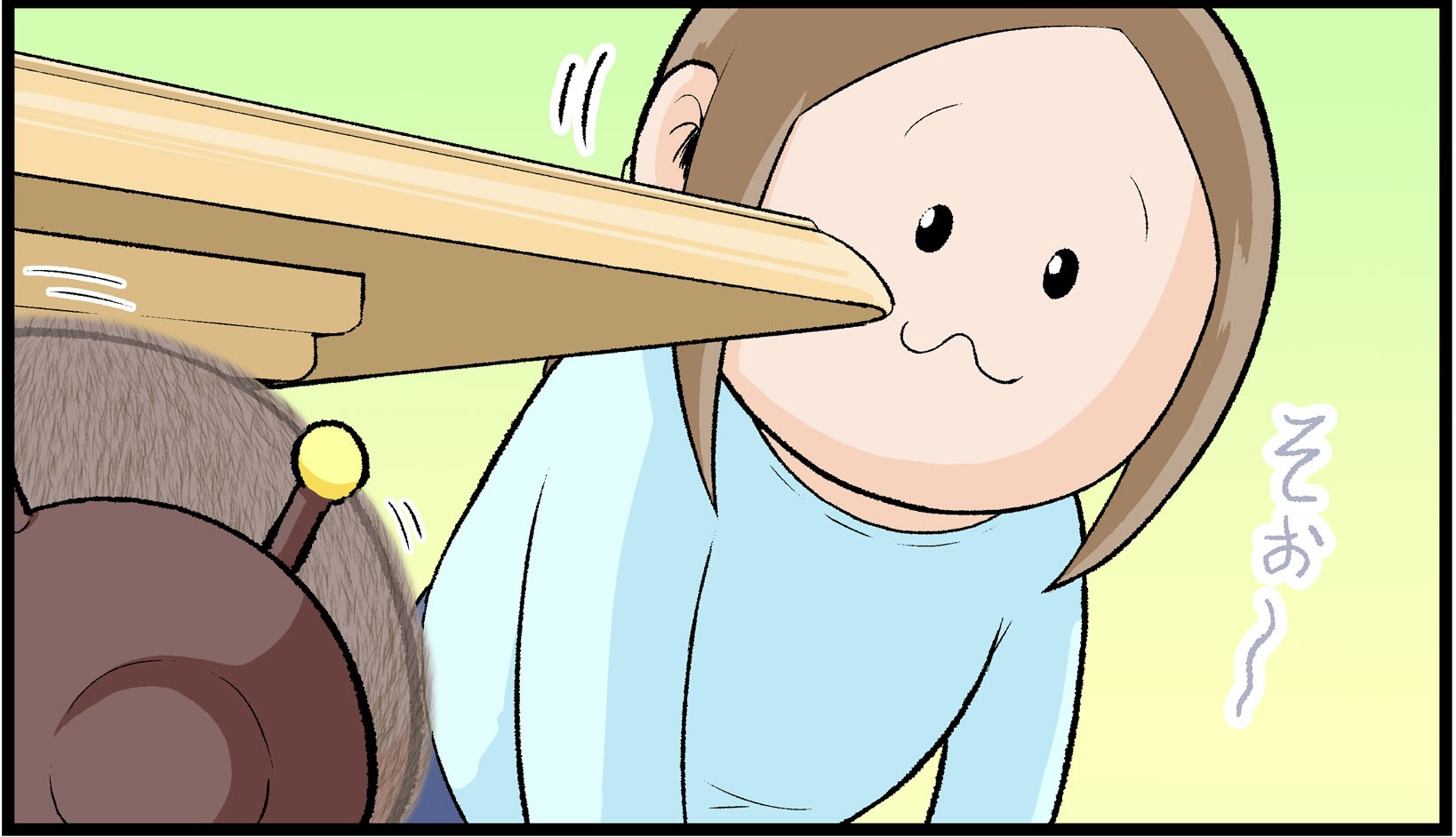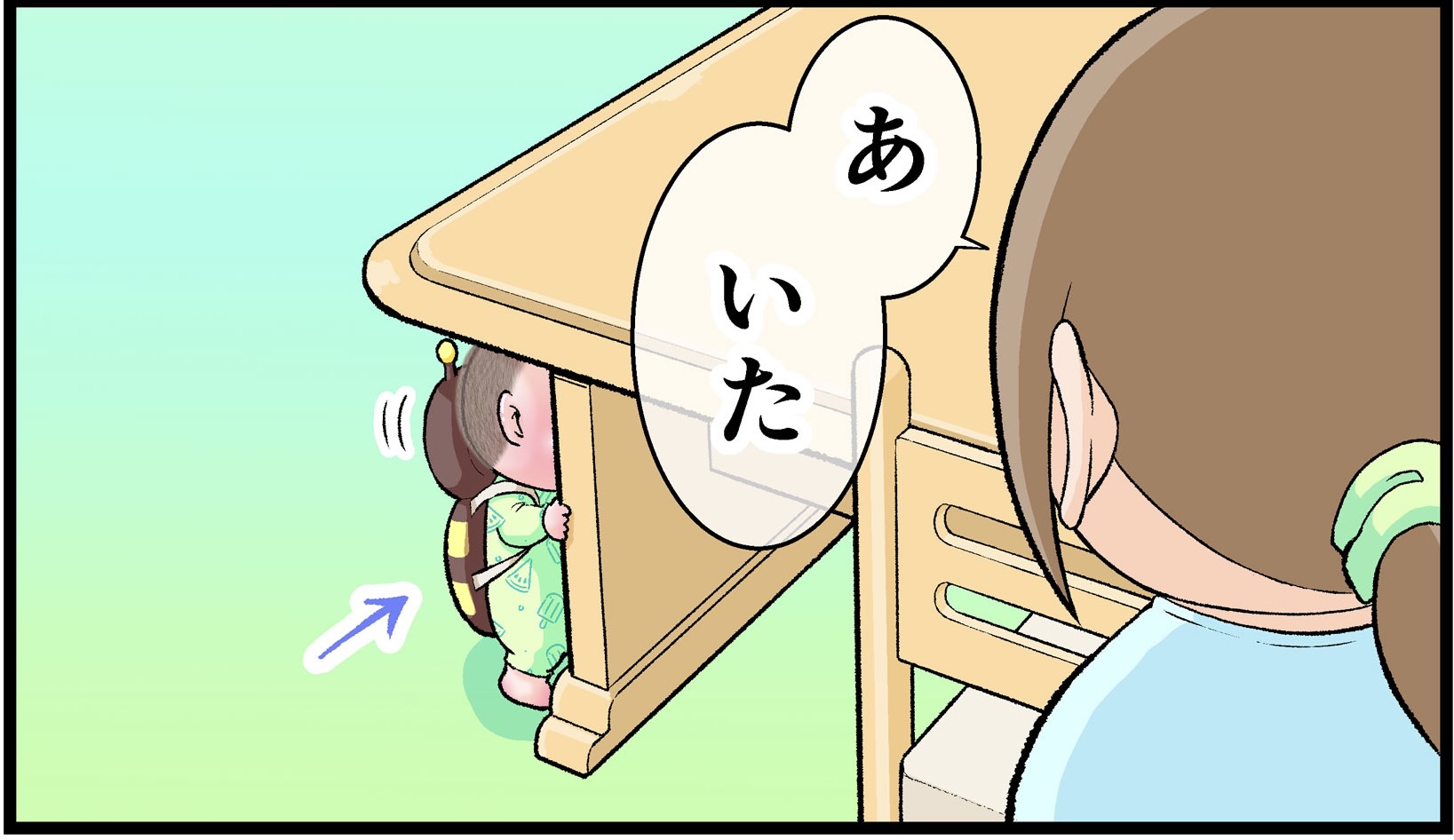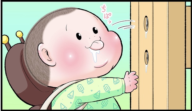 つかまり立ちして間もない頃、思いもしないものをナメナメしていることがありました。ぷにすけも同じ時期、お風呂のドアの留め具を舐めようとしていたので、子どもの興味は想像のナナメ上をいくなぁと驚くと同時になかなか目が離せないなぁと思いました。