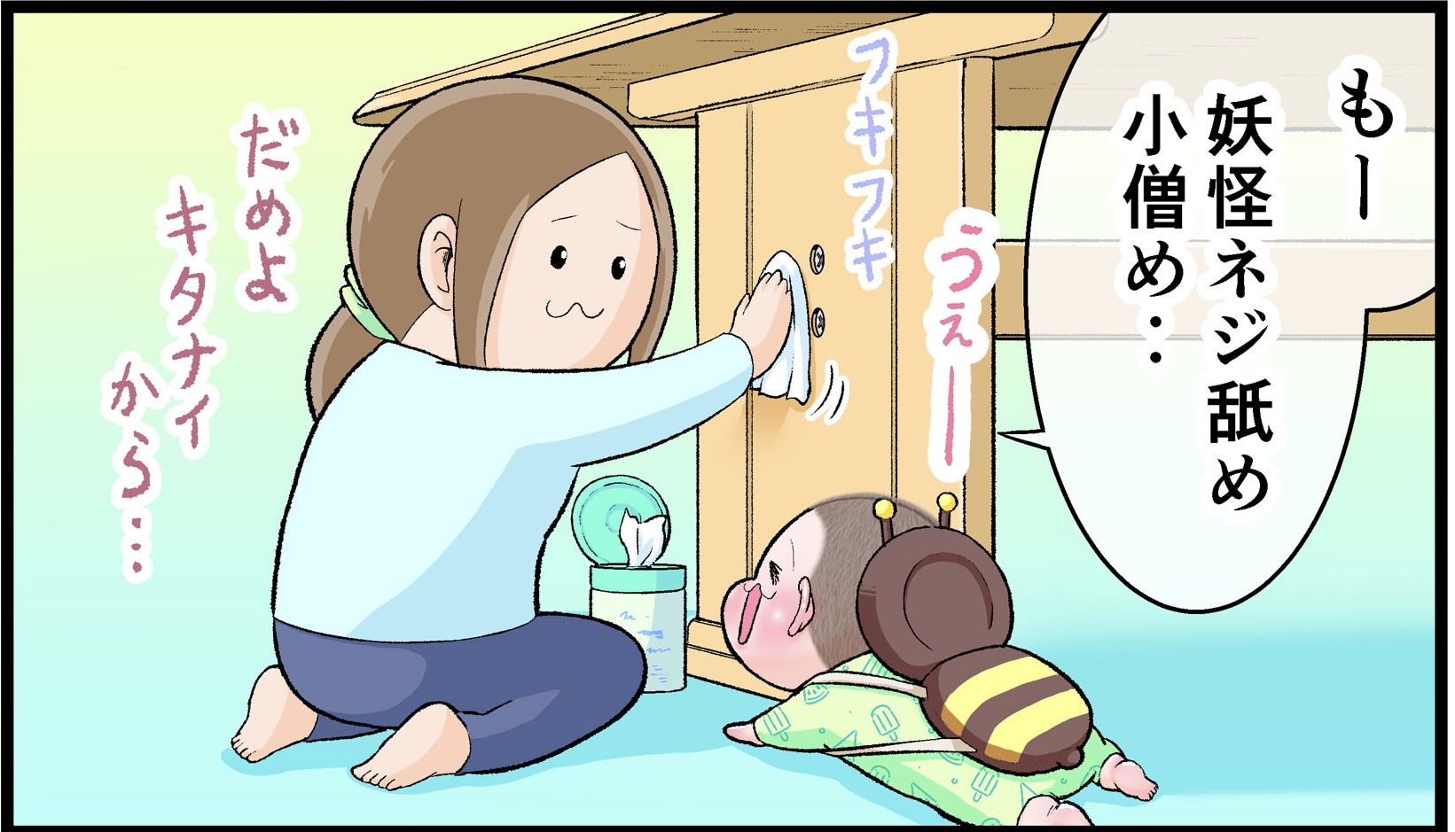 つかまり立ちの時期は行動範囲が広がるので、注意が必要です。いつ「妖怪ネジ舐め小僧」が現れても良いように、お部屋の中を注意深く点検しながら掃除をしておくと安心ですよ。