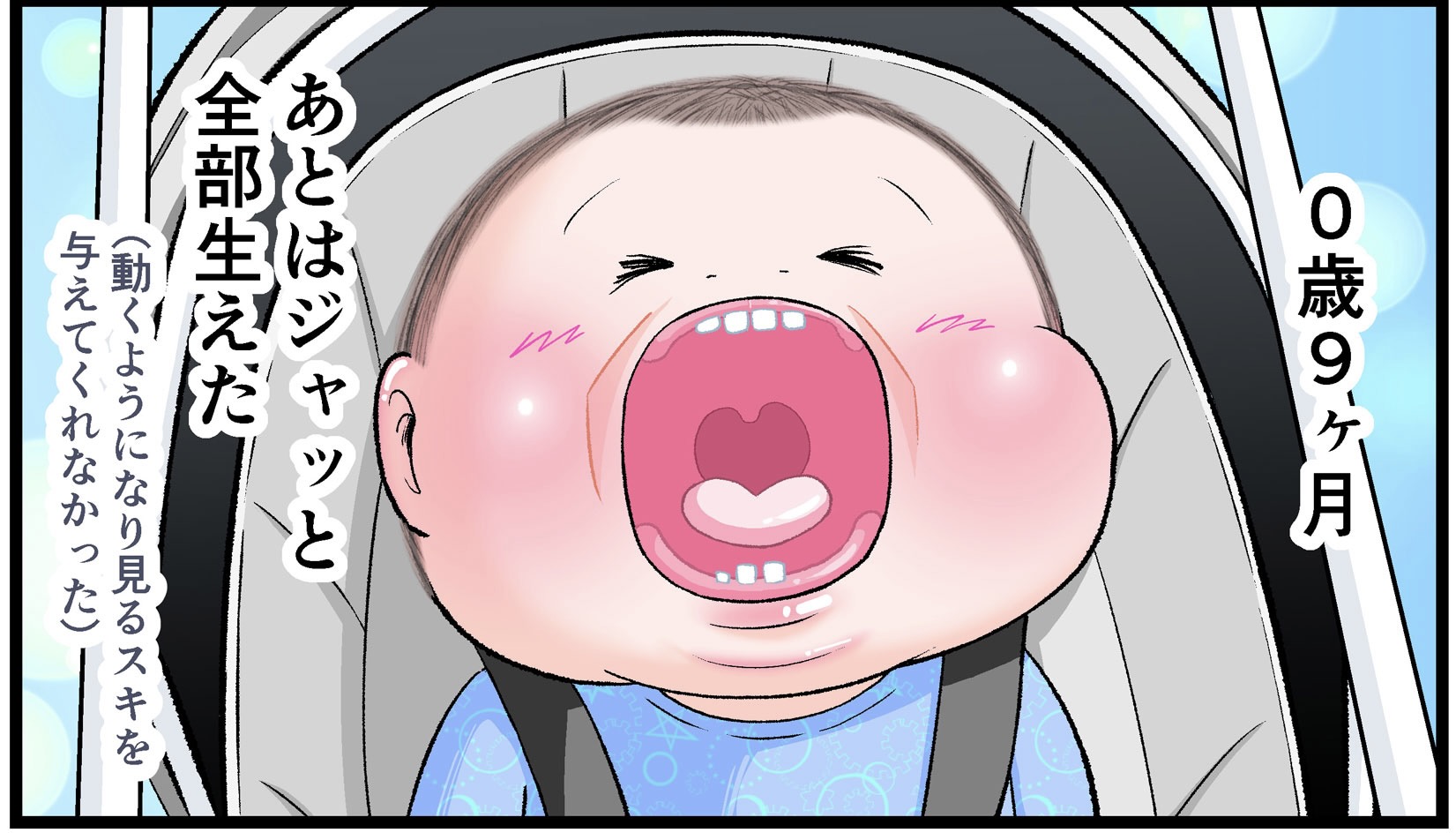 生え始めの乳歯を始めて見たときは、ちょこんと出ている白い歯に何とも言えない可愛らしさを感じて悶絶し、これからどのように生えてくるのか全部生えそろうまでしっかり見ておこうと心に決めました。しかし、寝返りが始まると動きが機敏になり、どうしても歯の成長を観察する余裕がなくなりました。気付いたころには全部生えそろっていて、歯の成長を見逃してしまったことが心残りでした。