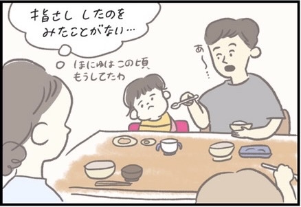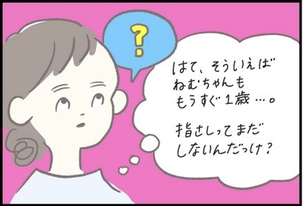 第二子・ねむちゃんが生後11ヶ月の頃、まだ「指さし」をしていないことに気がついたつぶみさん。そんなママの心配をよそに、指さしをすんなりと披露するねむちゃんのエピソードでした。