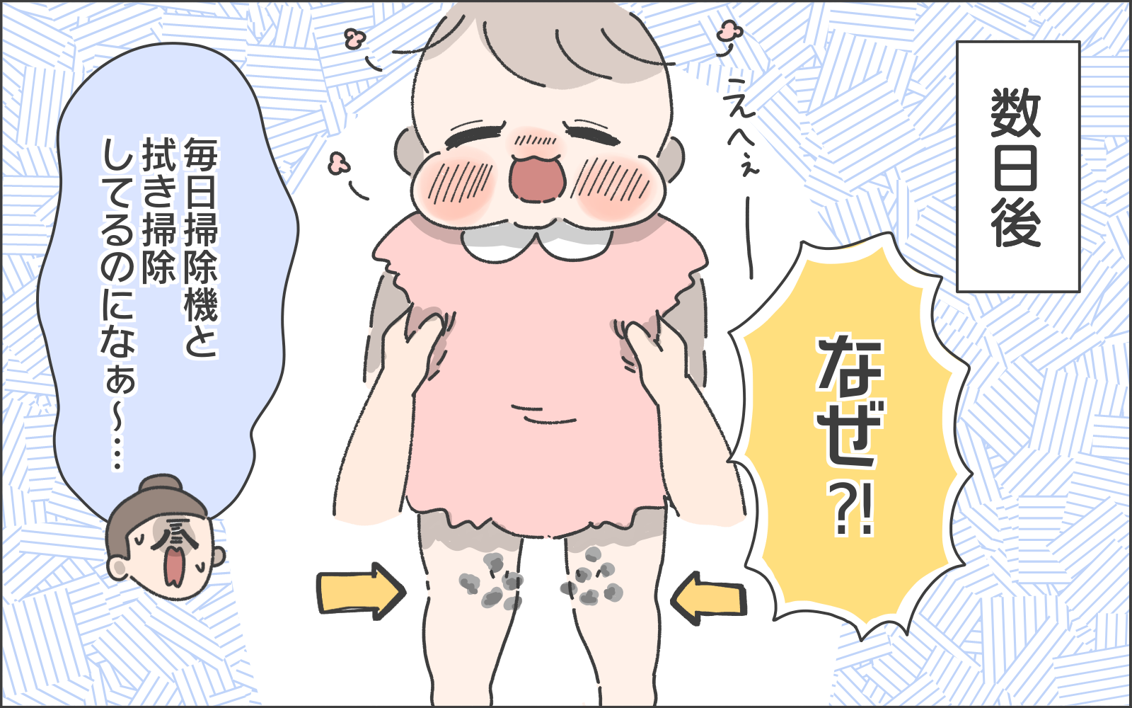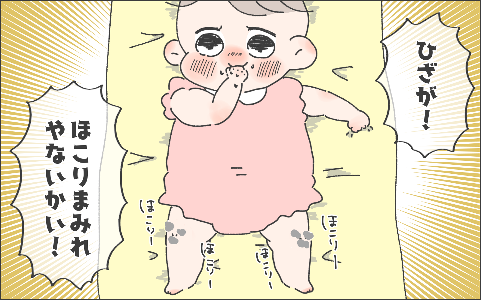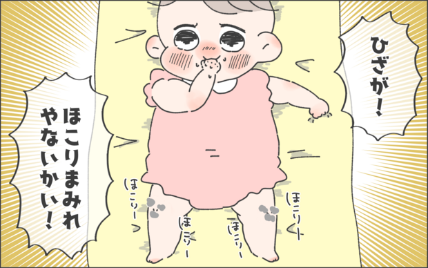 第二子こまめちゃんの育児に奮闘中のおかめさん。ある日、こまめちゃんのおむつ替えをしたときに、膝にほこりがついていることに気が付きました。
