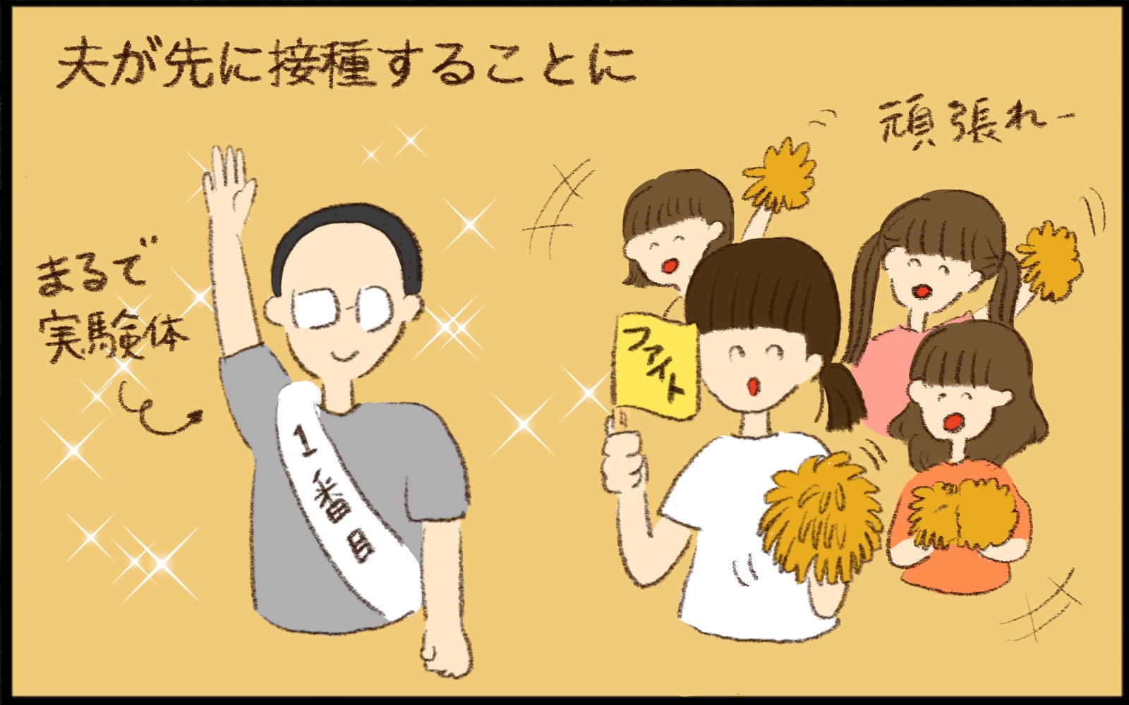夫の会社を通しての予約なのでまずは夫が接種することに。しかし、ワクチン接種後の症状の情報が少ない中、どのような症状が出るのか見てみたかったので自分たちで予約を取ったとしても夫に先に打ってもらったかもしれません。