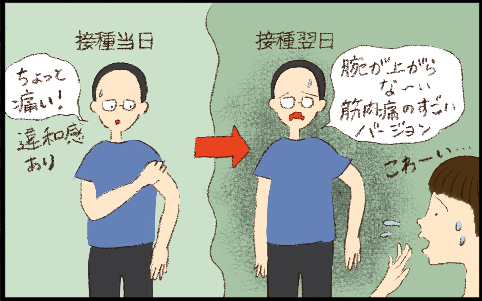 夫は接種した数時間後から肩に筋肉痛のような痛みを感じたようです。そして翌日は痛くて腕が上がらないほどに。