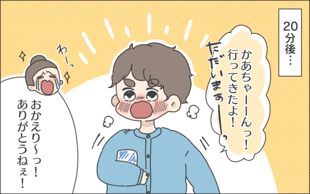 もちろん、こっそり夫の見守り付き。それでもおまめくんがおつかいに行っている間は「無事お店に行けたかな?」「ちゃんと買えたかな?」などと心配するおかめさん。