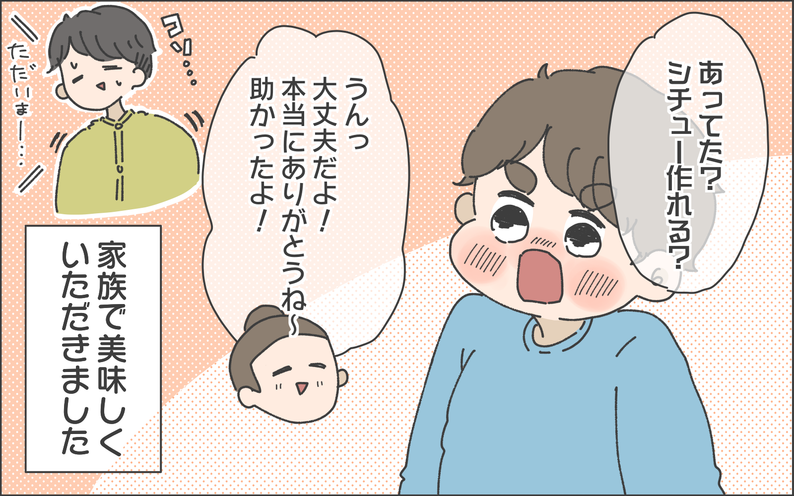 そして無事に帰宅したおまめくんが買ってきたのは、シチューのルーではなくなんとクラムチャウダーのルーだったそうです。それでも、買ってきてくれたものを使ってお料理も完成!