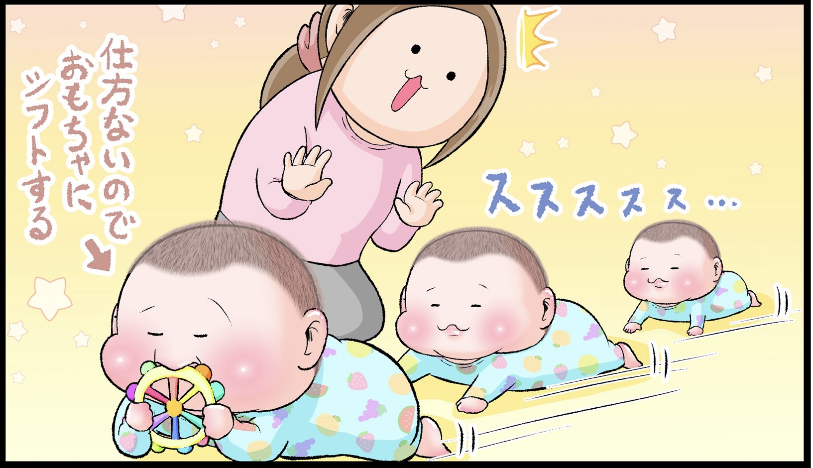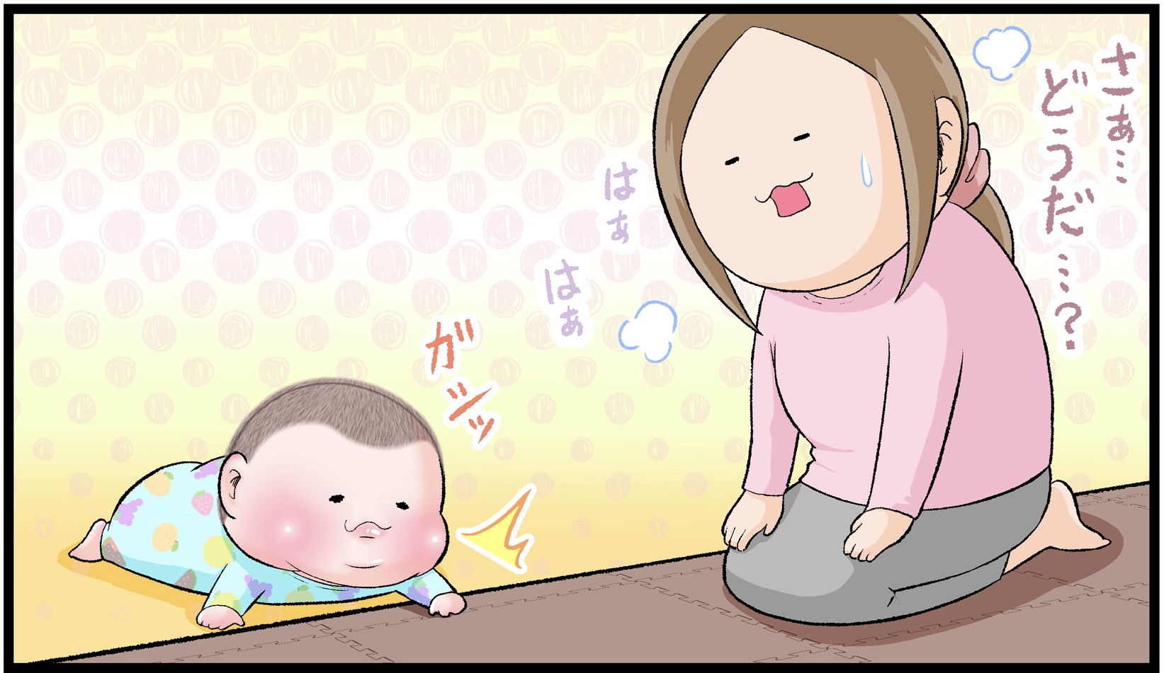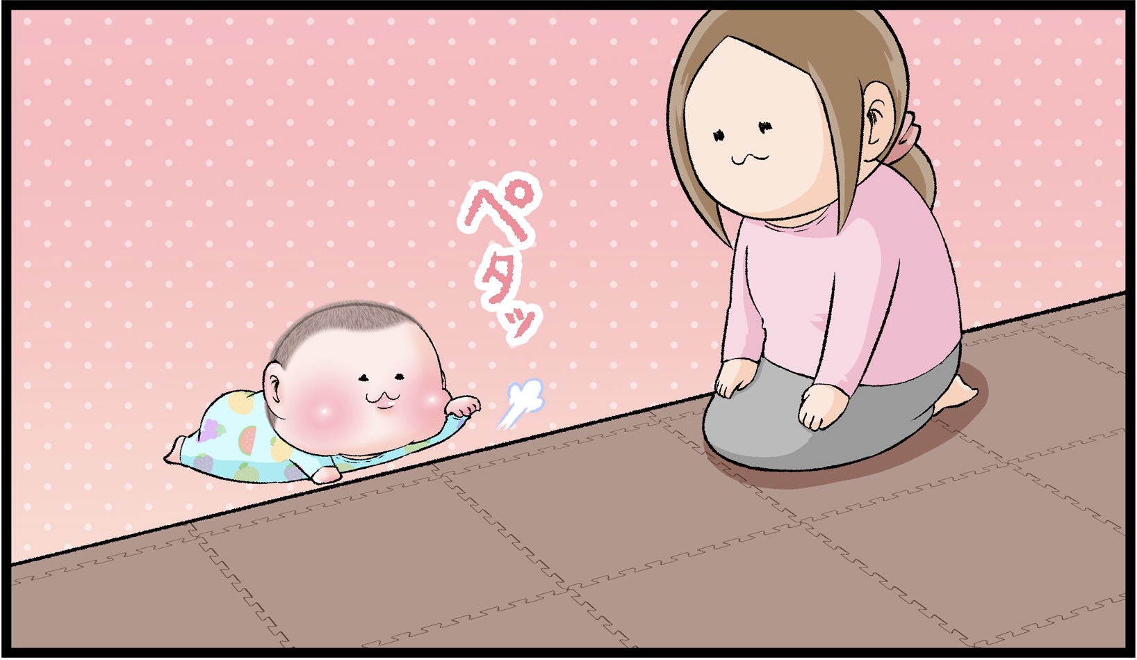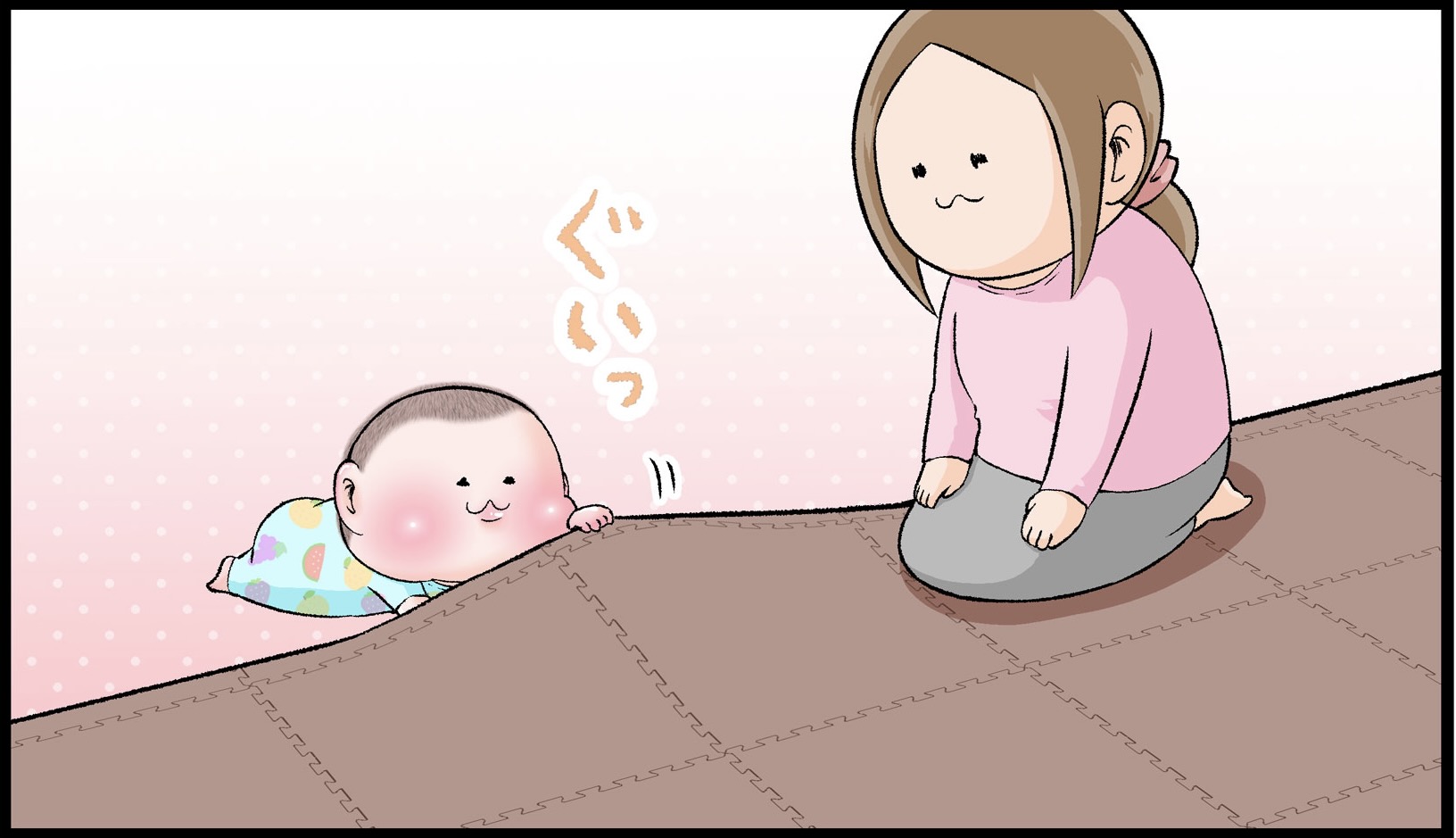長男・ぷにおくんが生後6ヶ月〜生後10ヶ月頃まで続いたジョイントマット攻防戦ですが、いよいよ勝敗が決まりました。結果はママの勝利で幕をとじたようです。最後のコマから、にくきゅうぷにおさんの心の底から湧き上がるやり切った感が伝わってきます。