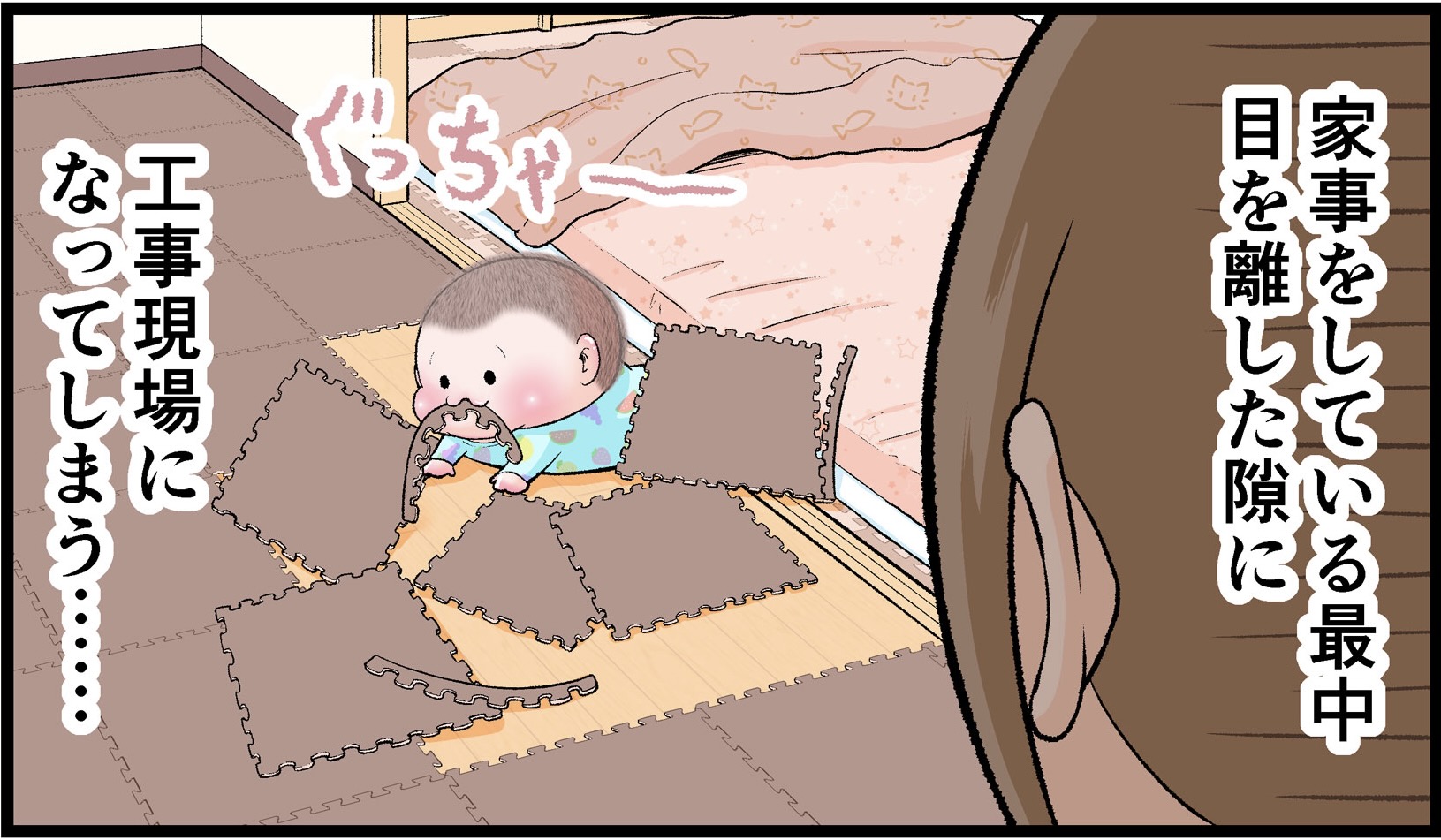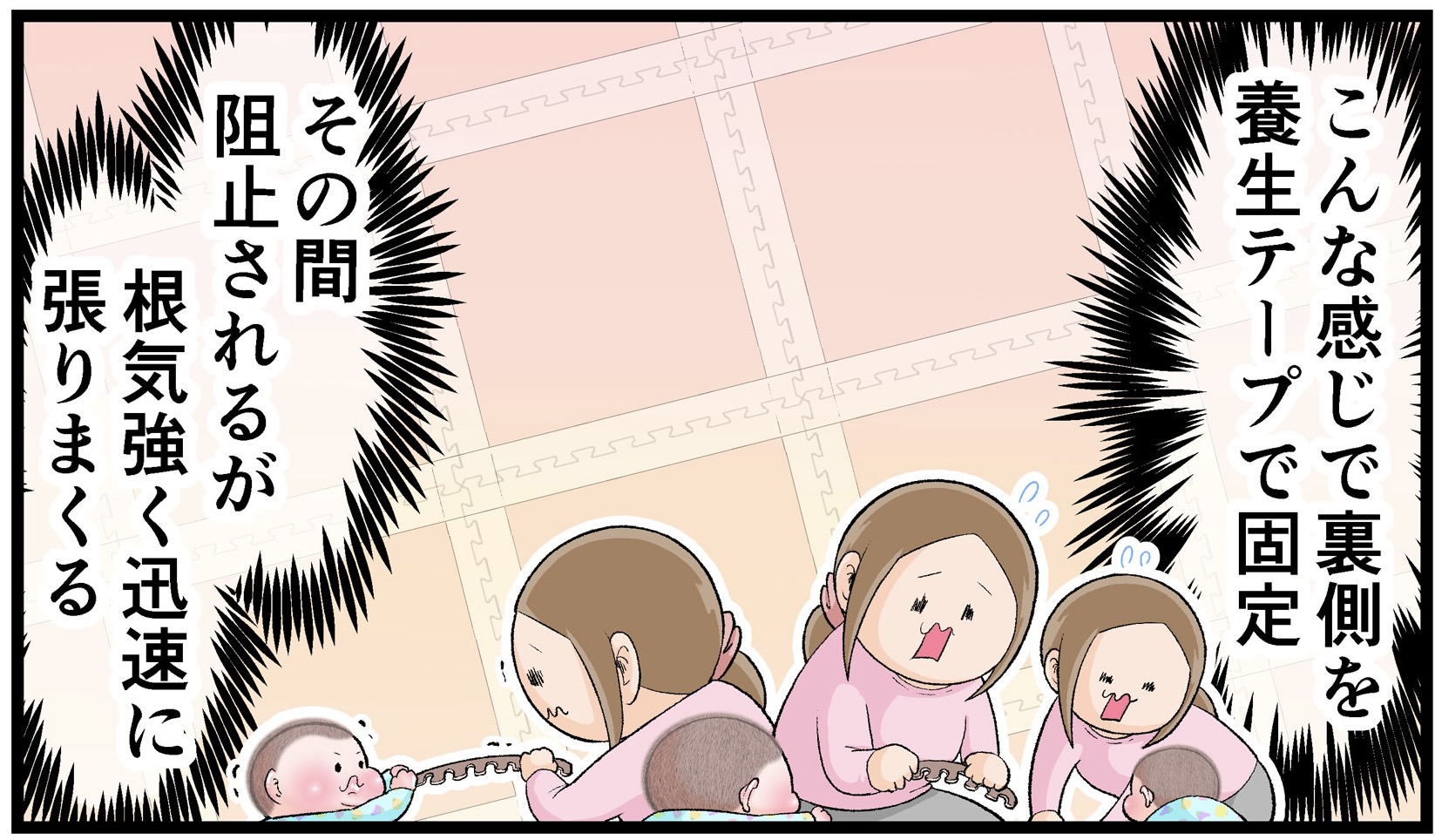 赤ちゃんが転倒したときのケガの防止や階下への防音対策としても使えるジョイントマット。赤ちゃんにとっては身近なおもちゃに感じるのかもしれませんね。にくきゅうぷにおさんの家庭と同じよう、ジョイントマットを整えた矢先から赤ちゃんがはがしてしまい困っている方は「裏側を養生テープで固定作戦」を参考にしてみてはいかがでしょうか。
