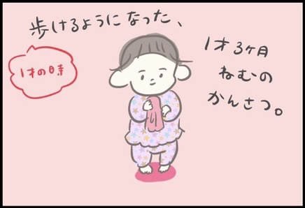 つぶみさんの長女・ねむちゃんは1歳頃から歩き始めたようです。歩くときの「ぱっちょん」という音や内股の足、走ってる(つもりの)姿など、この時期ならではのかわいいポイントがたくさんつまっていますね。タオルを片手に「まっま」と呼ぶねむちゃんの姿に、つぶみさんと一緒になって胸キュンした方も多くいるのではないでしょうか。