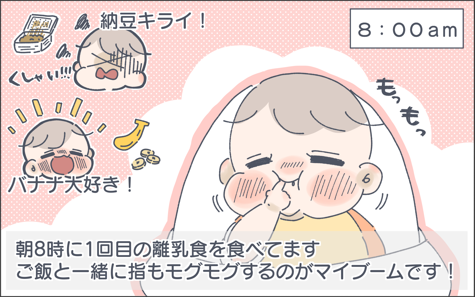 朝は、ペンペンとママの顔を叩き、起こしてくれるそう。そして離乳食を食べるときは、好き嫌いをしながらももぐもぐ。そして必ずおてても一緒にもぐもぐ。赤ちゃんらしい、なんとも可愛らしいひとコマばかりです。