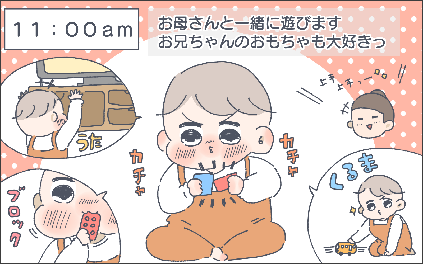 また、くるまやブロックなど、お兄ちゃんのおもちゃが好きなところは、兄弟がいる赤ちゃんならではのことかもしれませんね。