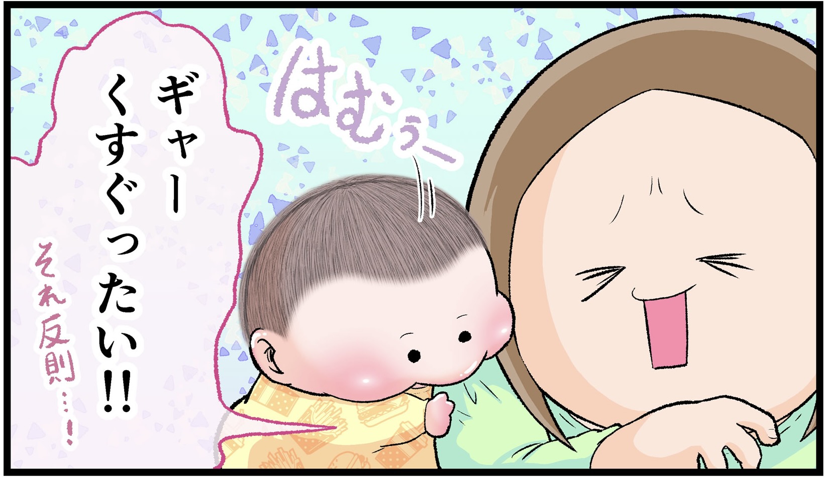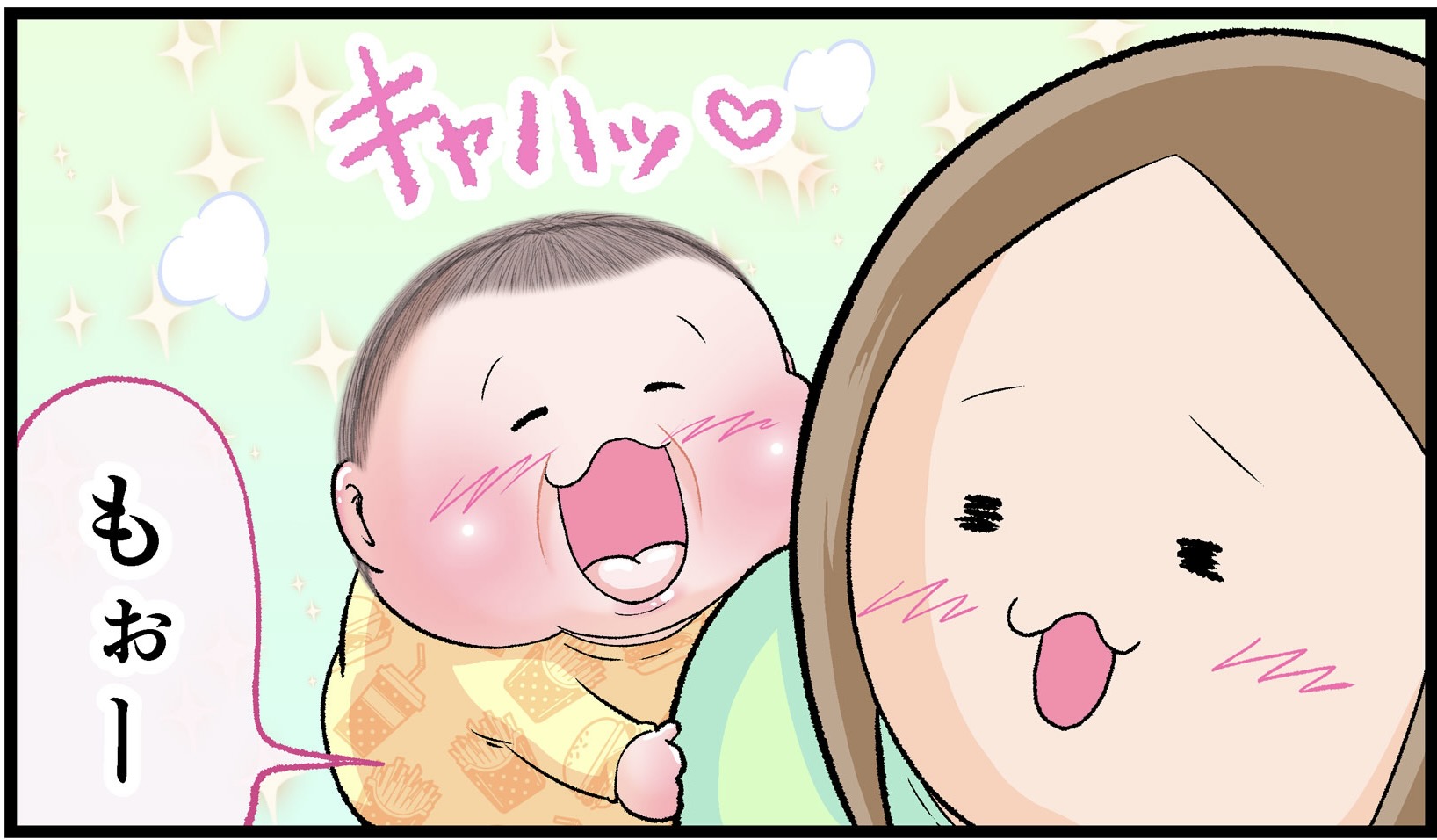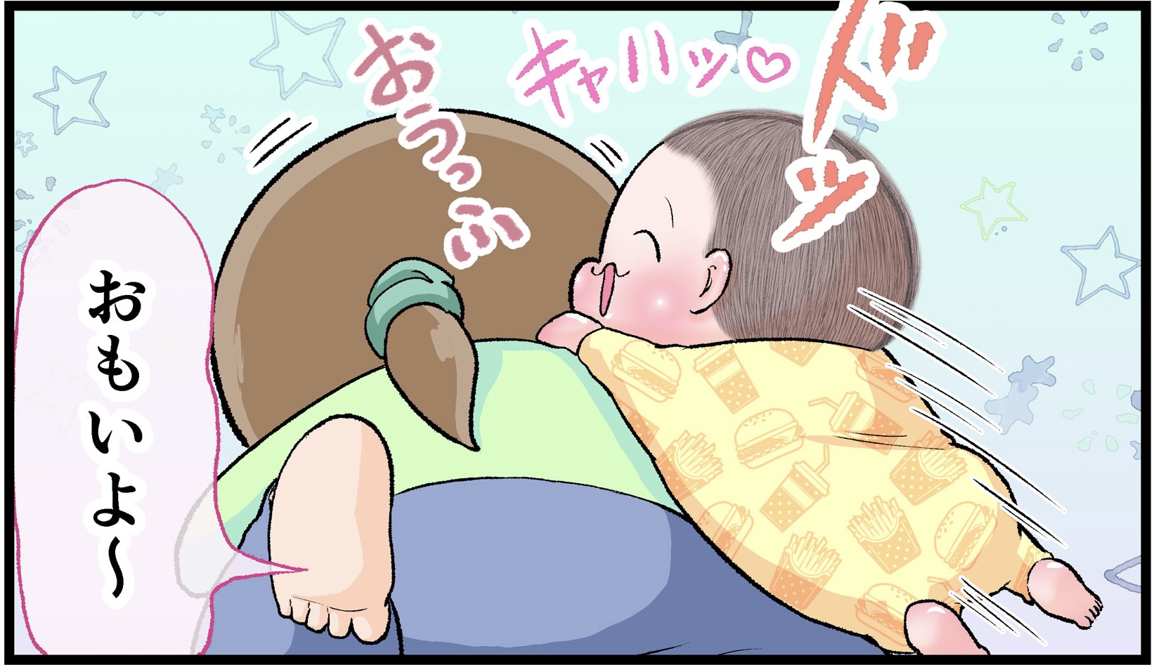 髪の毛を引っ張ったり、くっついたりしながら「ママともっと遊びたい」という気持ちを伝えるにくきゅうぷにおさんの長男・ぷにおくん。生後9ヶ月ごろは、反則技「肩ハムハム」をくりだすことで見事ママに遊んでもらうことができたようです。