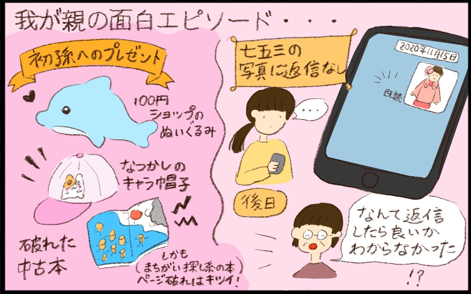 長女さっちゃんの3歳の七五三のときに、さっちゃんの着物の写真を母に送ったのですが既読になったまま返信がありませんでした。後日母に会った際に、なぜ返事をくれなかったのか尋ねたところ「着物を着た写真がかわいくて嬉しかったけど、この気持ちをなんて返せば良いかわからなかった」と言われて、想定外の答えに思わず笑ってしまいました。