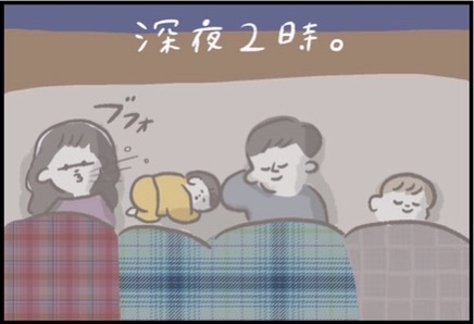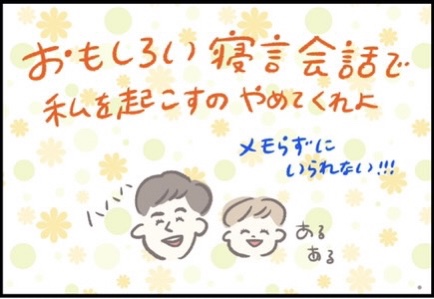 深夜2時。「おかあさん」という呼びかけに目をさましたつぶみさん。息子・ほにゅくん(3歳)とパパの奇跡の寝言会話に眠気がいっきに吹っ飛んでしまったようですね。そして、ほにゅくんは妹・ねむちゃん(1歳)のどんなかっこいい姿を夢のなかでみていたのでしょうか。とても気になりますが、翌朝ほにゅくんとパパに寝言会話のことを確認してみても、2人とも覚えていなかったようです。