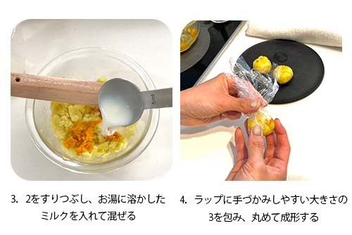 4.ラップに手づかみしやすい大きさの3を包み、丸めて成形する